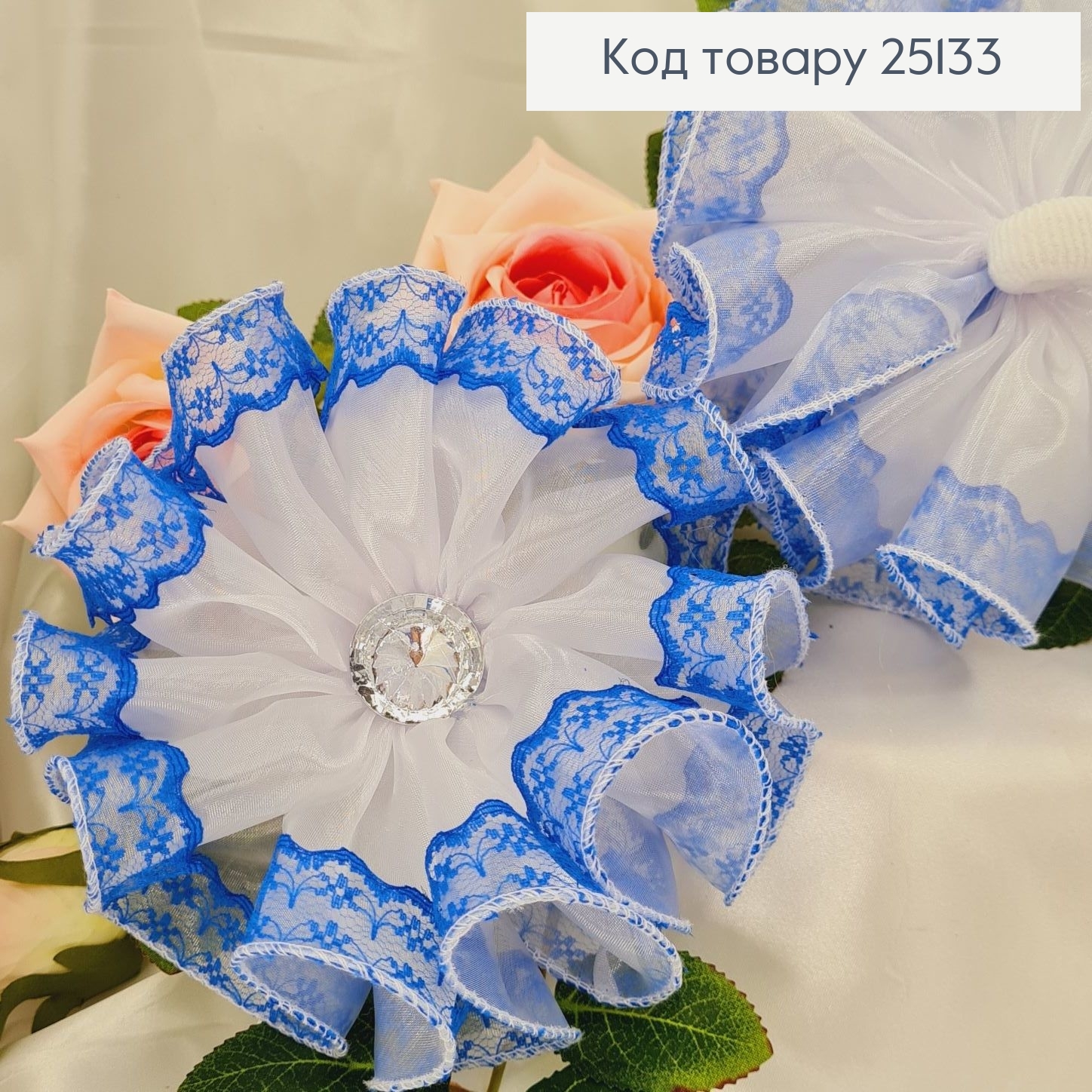 Бант атласний з мереживом СИНЬО-БІЛИЙ  на заколці "стріла", розмір 13*20см, ручна робота, Україна 276168 фото