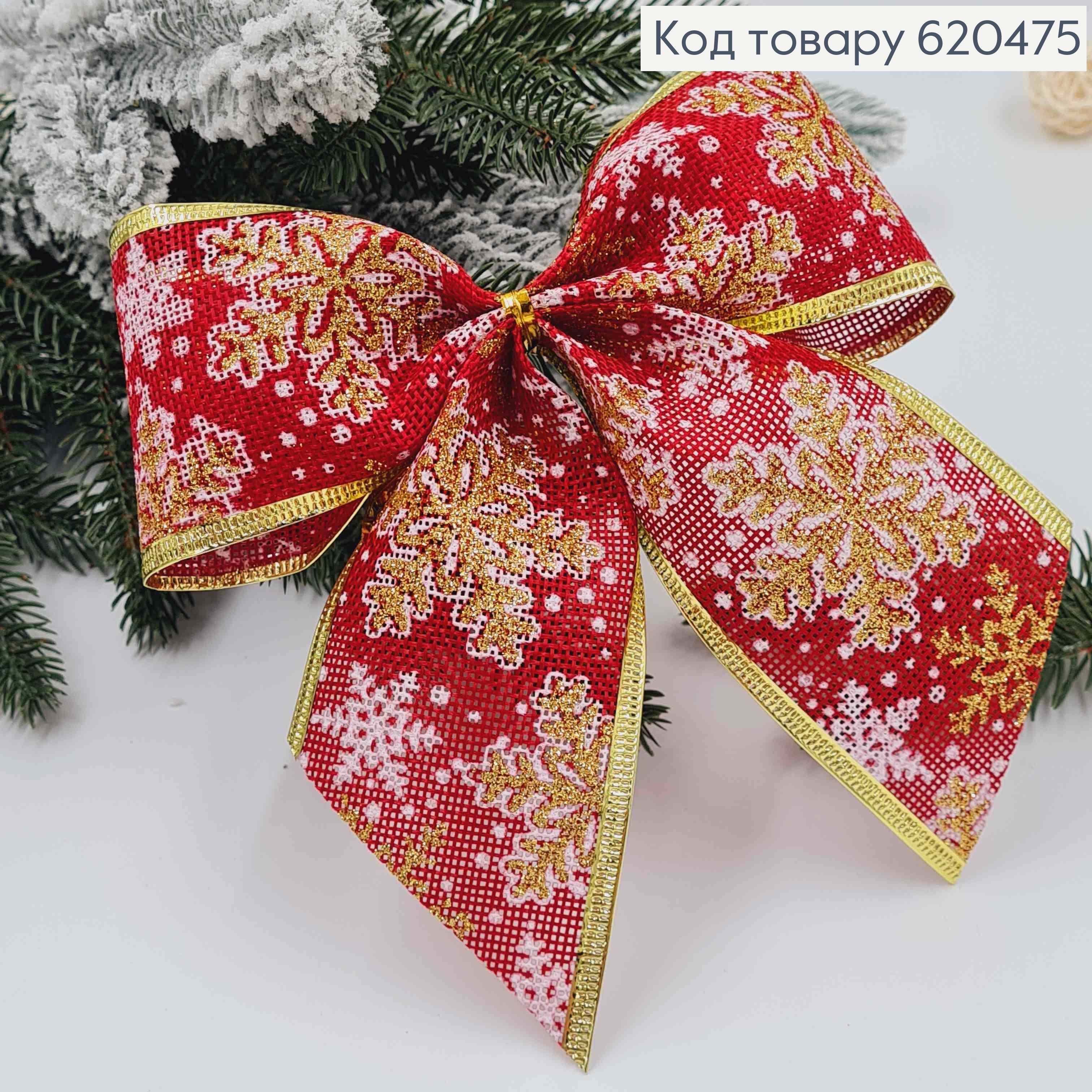 Бант льон, новорічний з блискучими Сніжинками ЧЕРВОНИЙ+ЗОЛОТО 16*16см (6см стрічка), ручна робота