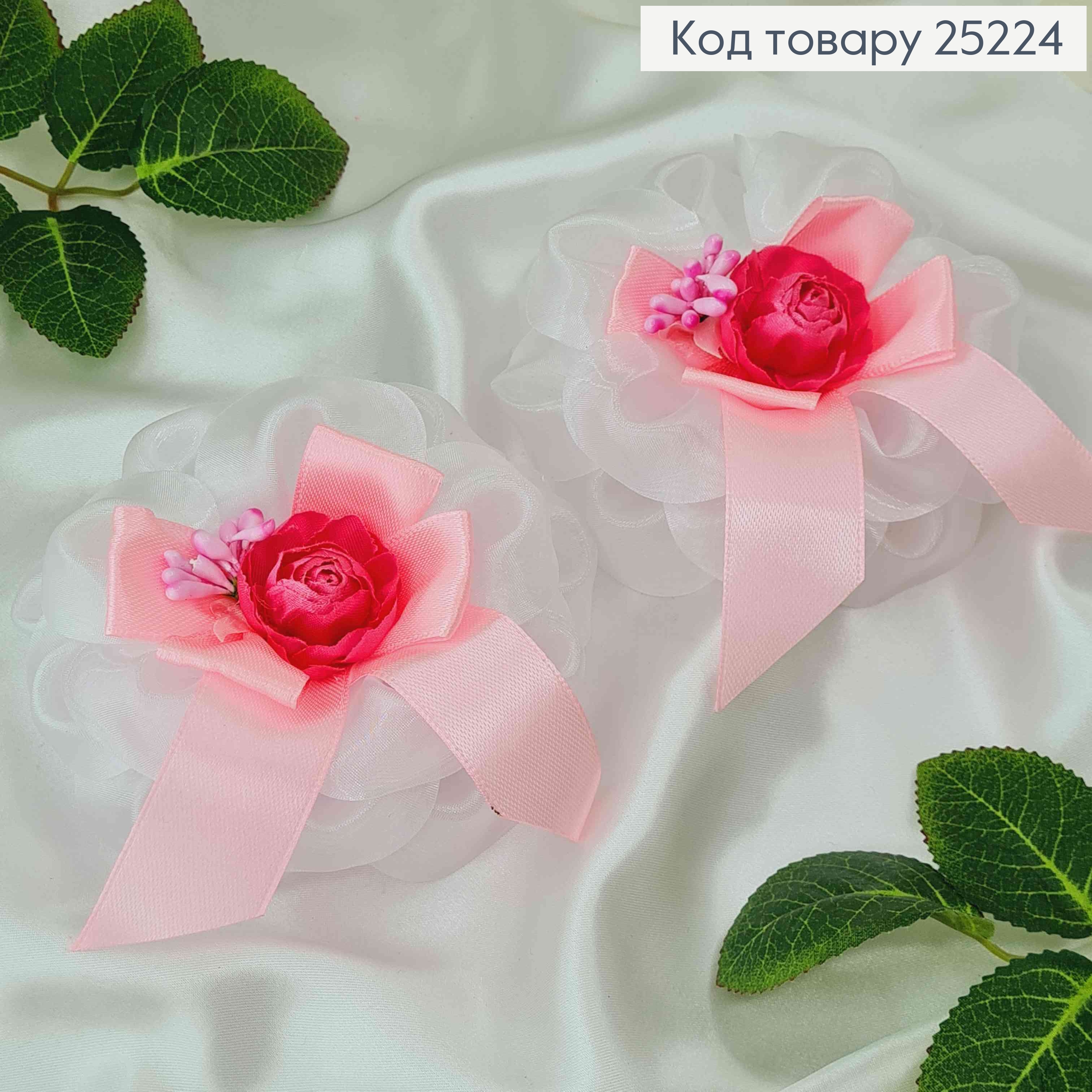 Бант на резинці, Рожевого кольору з квіткою та атласной рожевою лентою, 10см