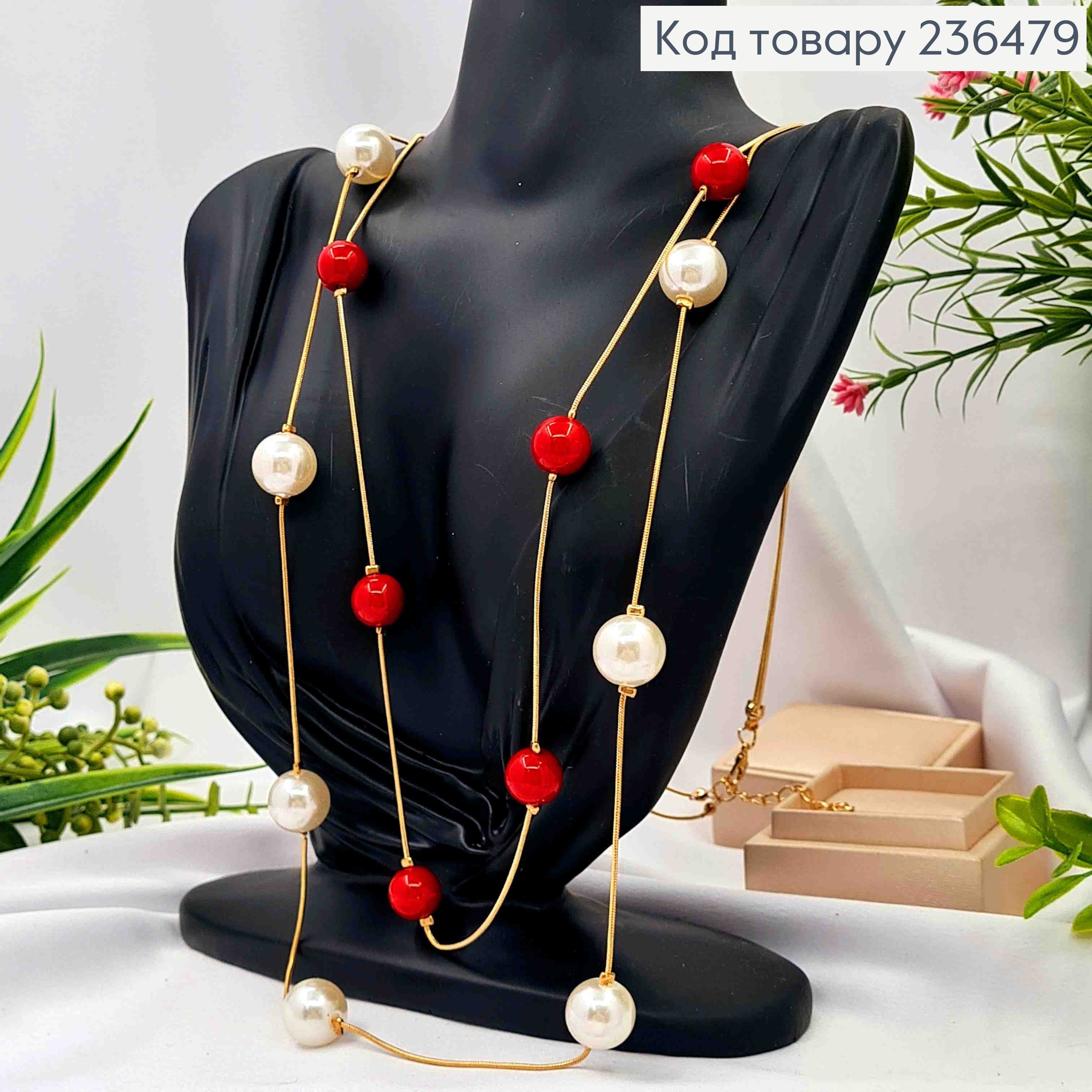 Біжутерія на шию подвійна з Перламутровими та Червоними бусинами, 90+4см, Золото кольору