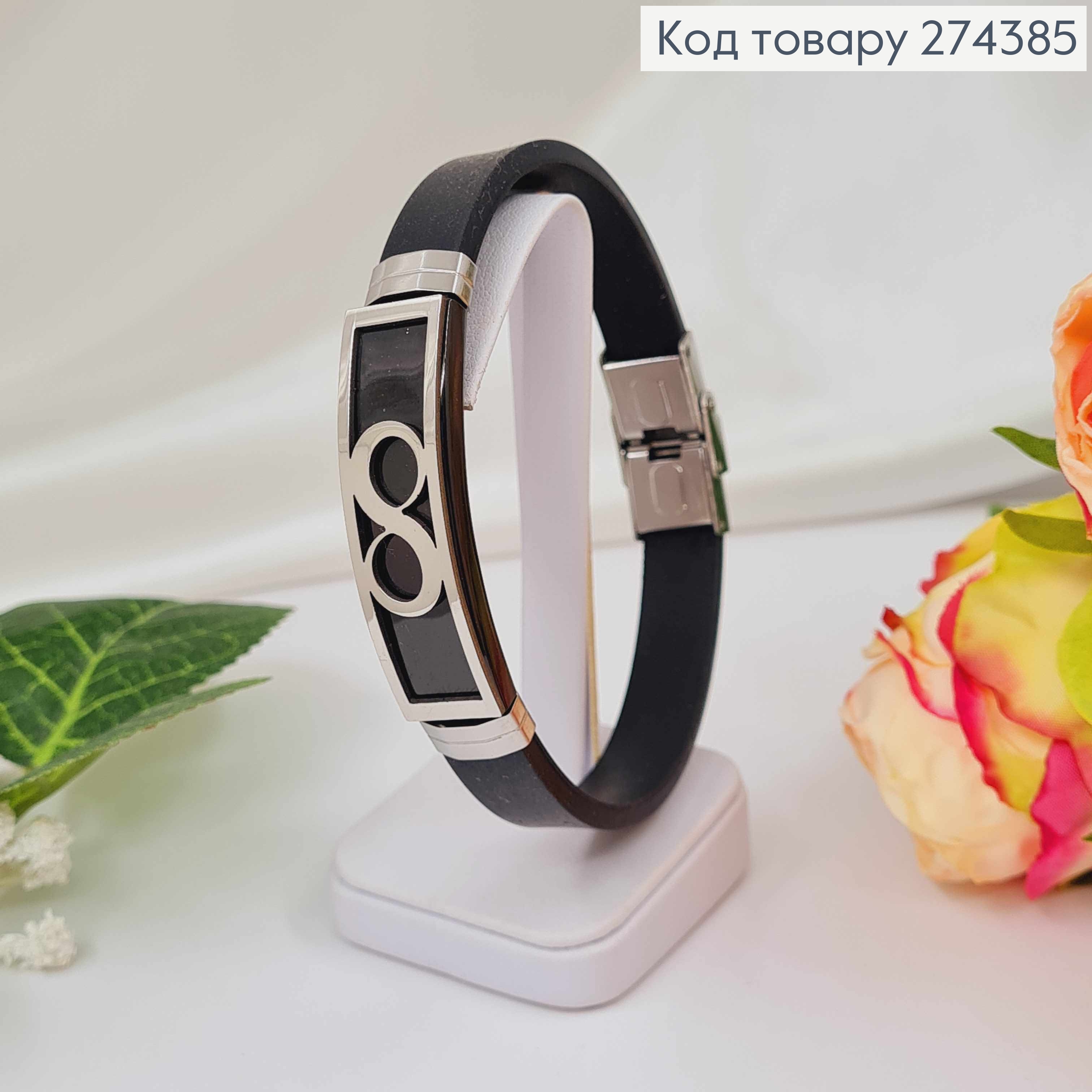 Браслет каучук, з металевою пластинкою, Знак Нескінченності, шир.1,1см, довж. 21см