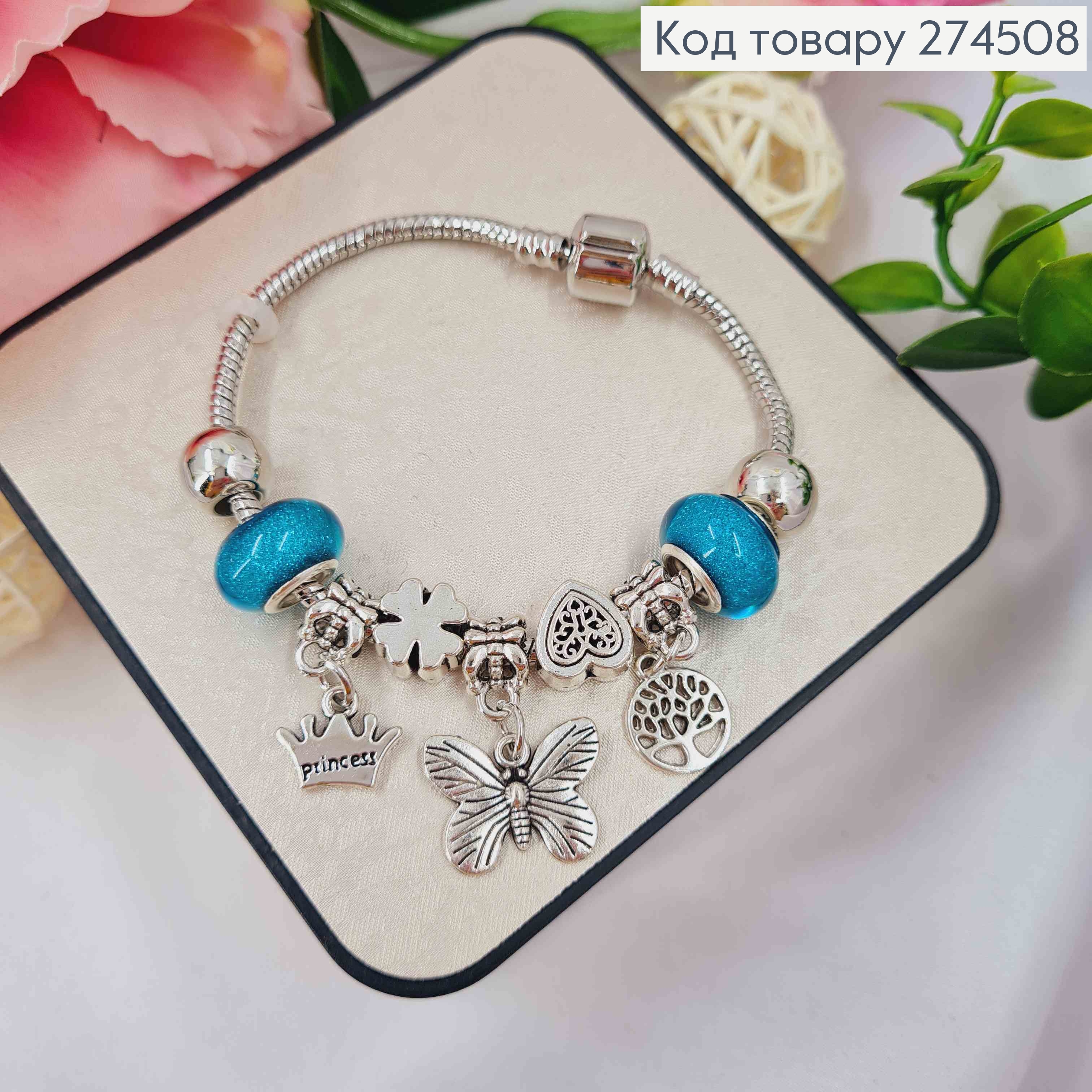 Браслет "ПАНДОРА" з Блакитним шармиком + (Метелик/Корона/Дерево), срібного кольору, біжутерія