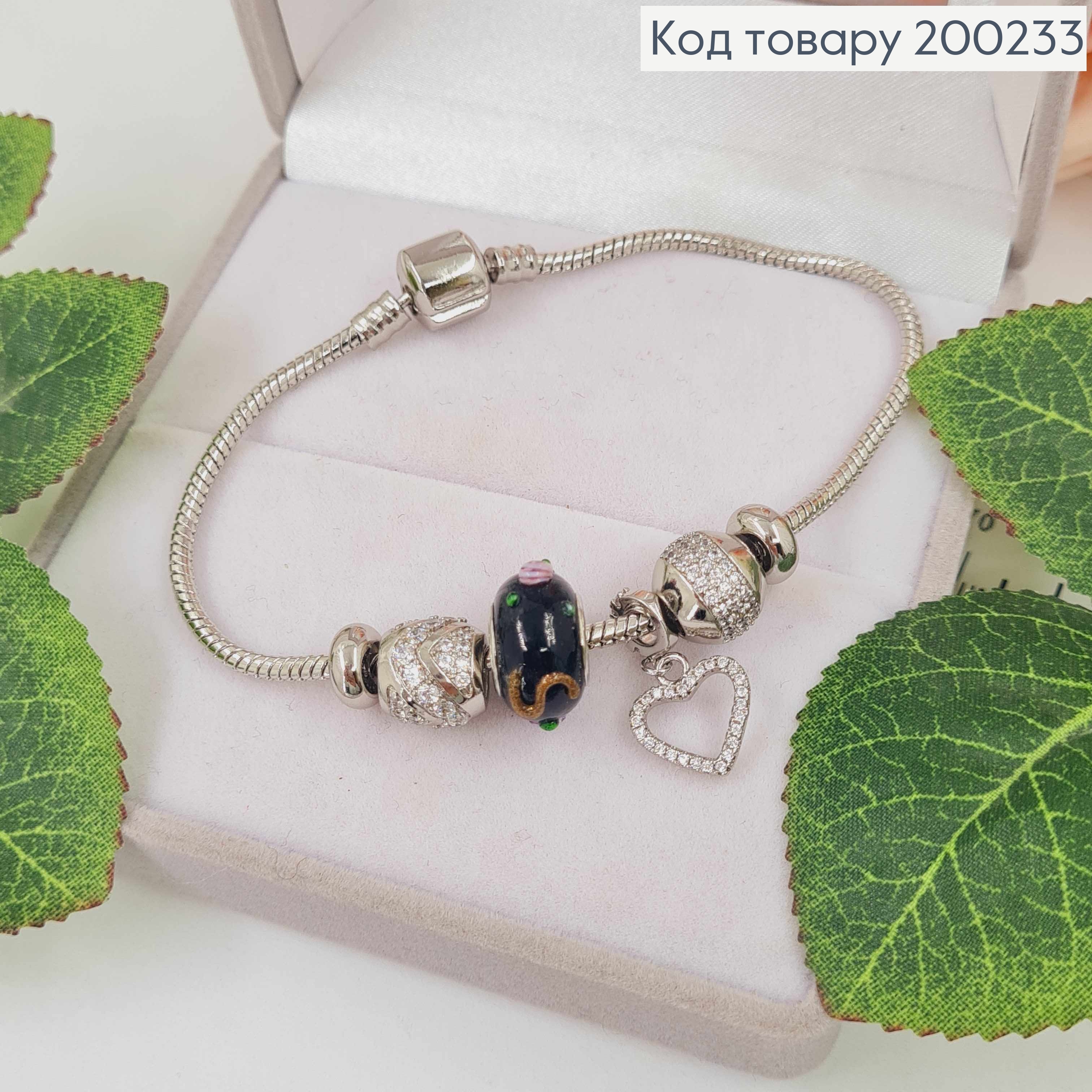 Браслет "Пандора" з Чорним шармиком з об'ємною ліпкою та сердечком в камінцях, довж 18см. Xuping 18