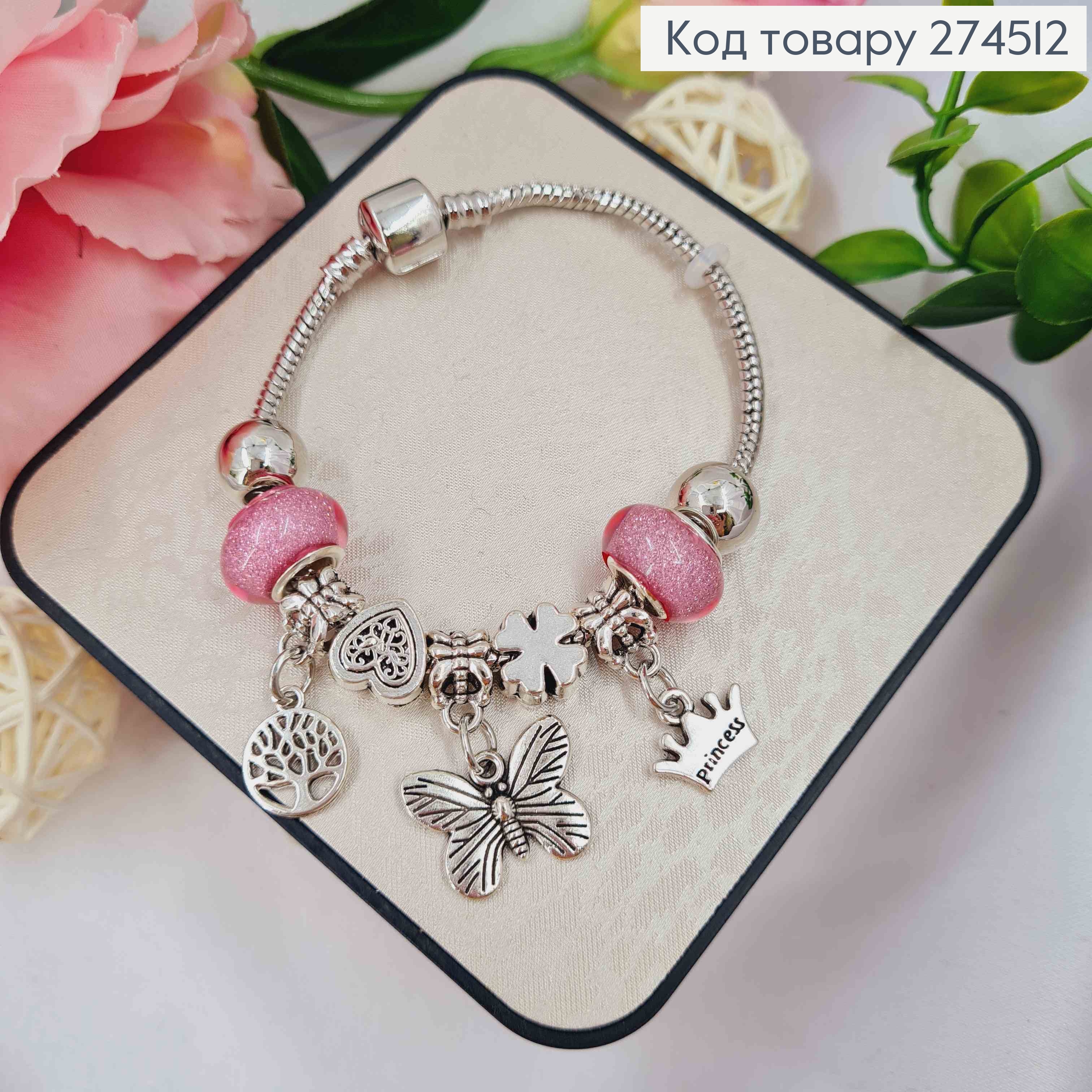 Браслет "ПАНДОРА" з Рожевим шармиком + (Метелик/Корона/Дерево), срібного кольору, біжутерія