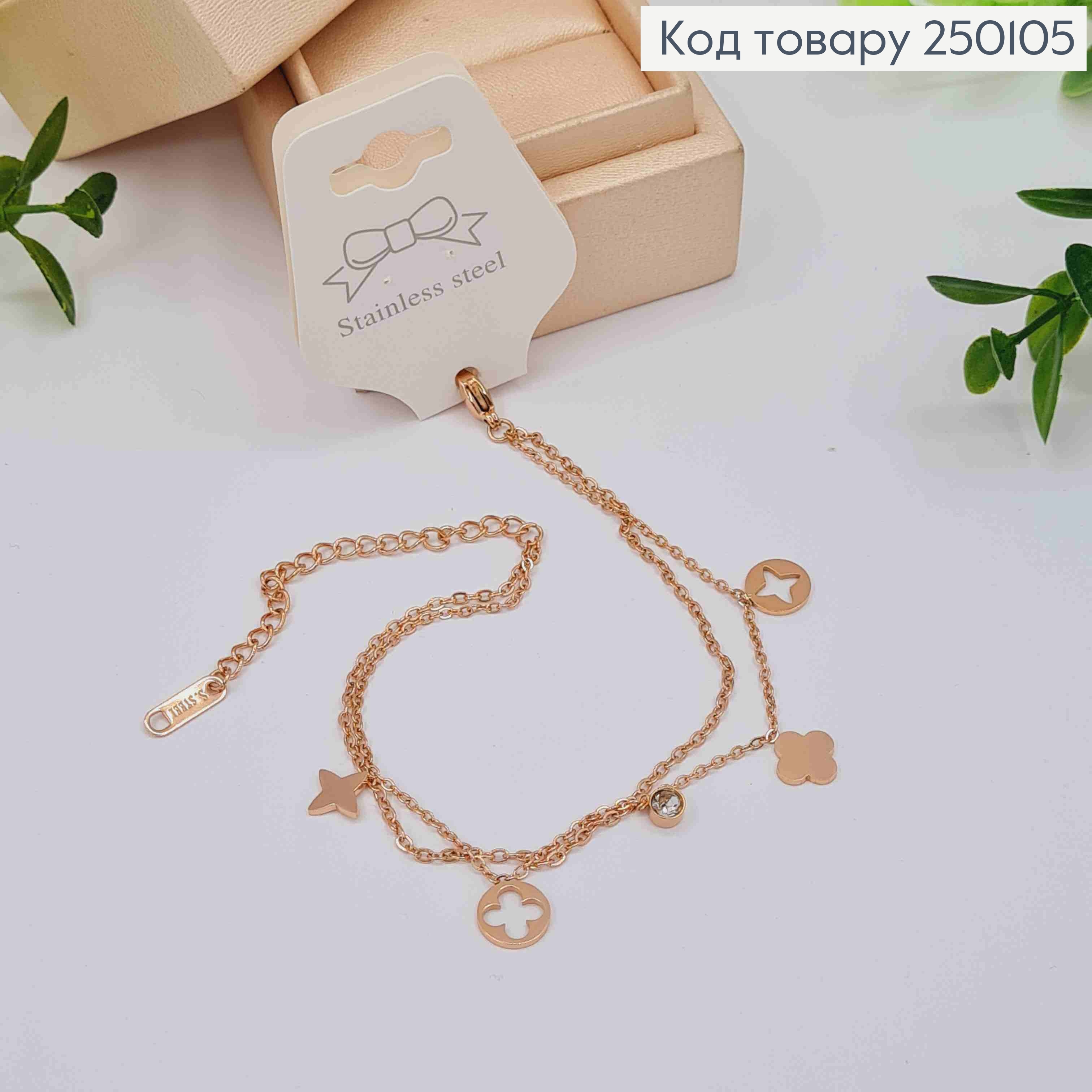 Браслет подвійний мідного кольору, з підвісками LV та камінцем, 18+5см, сталь Stainless Steel