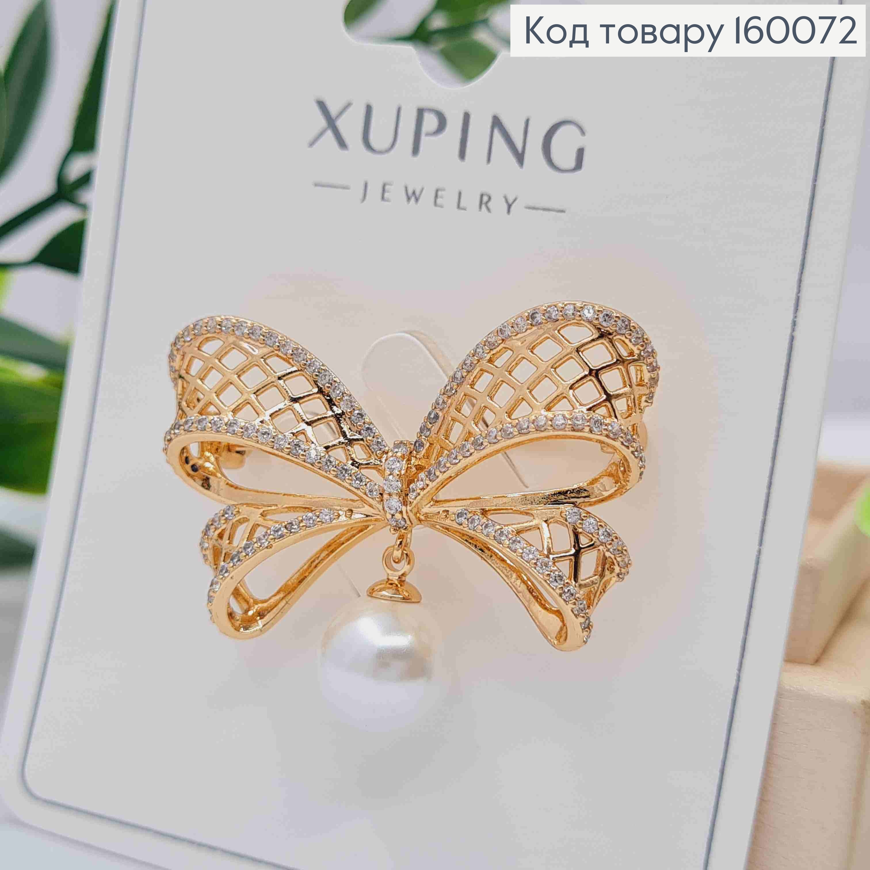 Брошка "Бантик" прикрашена Блискучими камінцями та Перлинкою, 2,5*3,7см, Xuping 18к