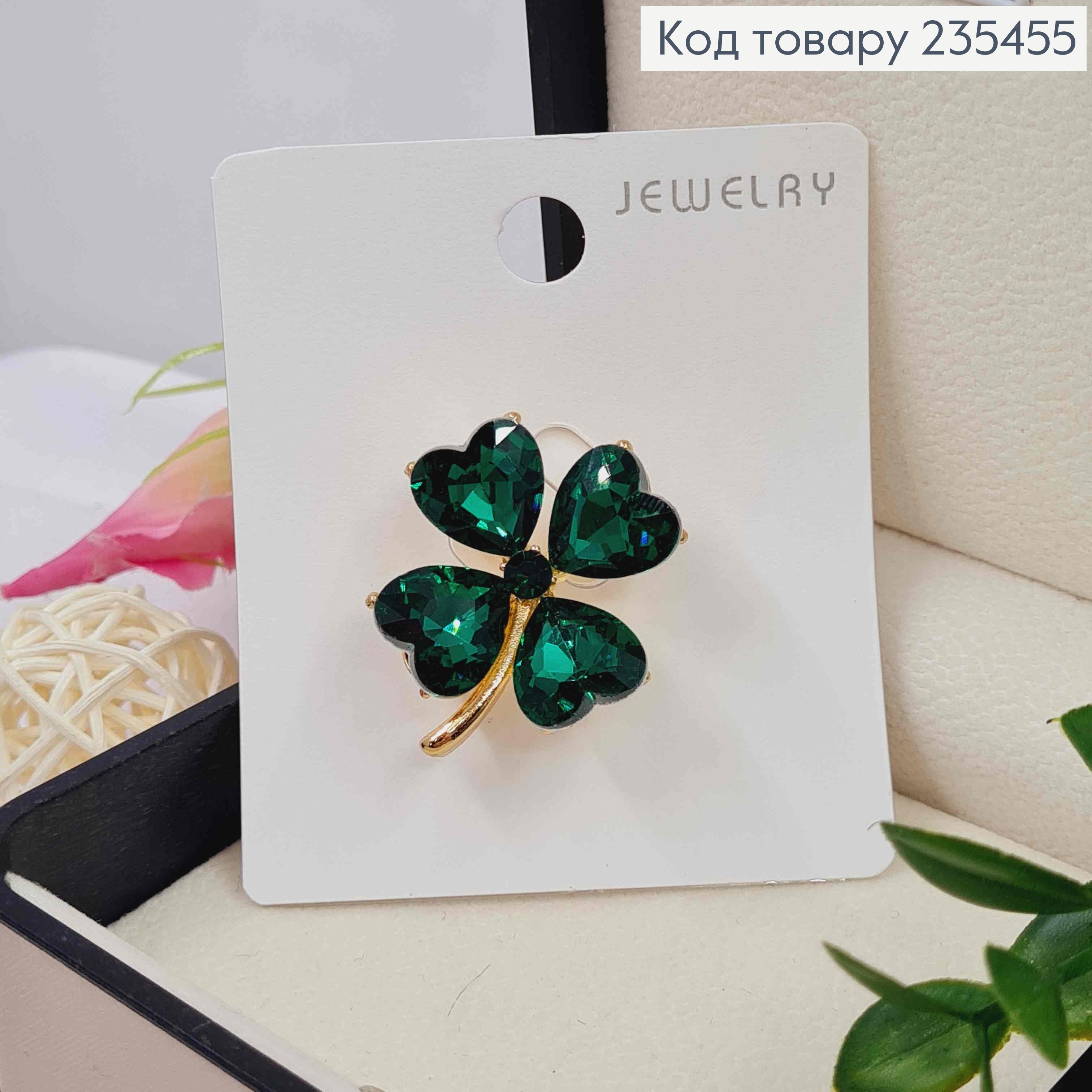 Брошка ЧОТИРИЛИСНИК з Зеленими камінцями, 2,5*3см, Золотого кольору
