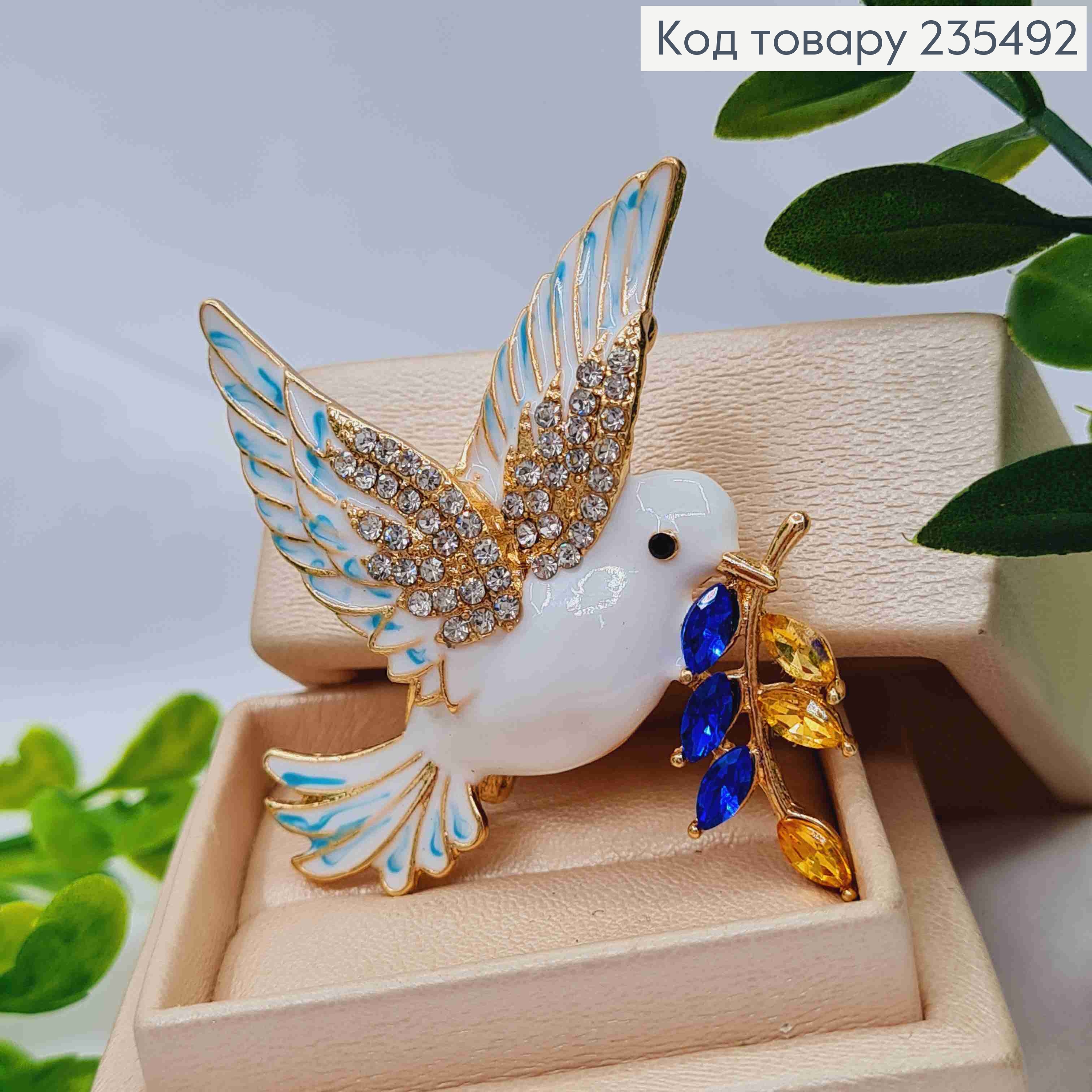 Брошка метал "ГОЛУБ МИРУ"  з Гілочкою з Жовто-Синіх камінців, 5,5*6см 235525 фото