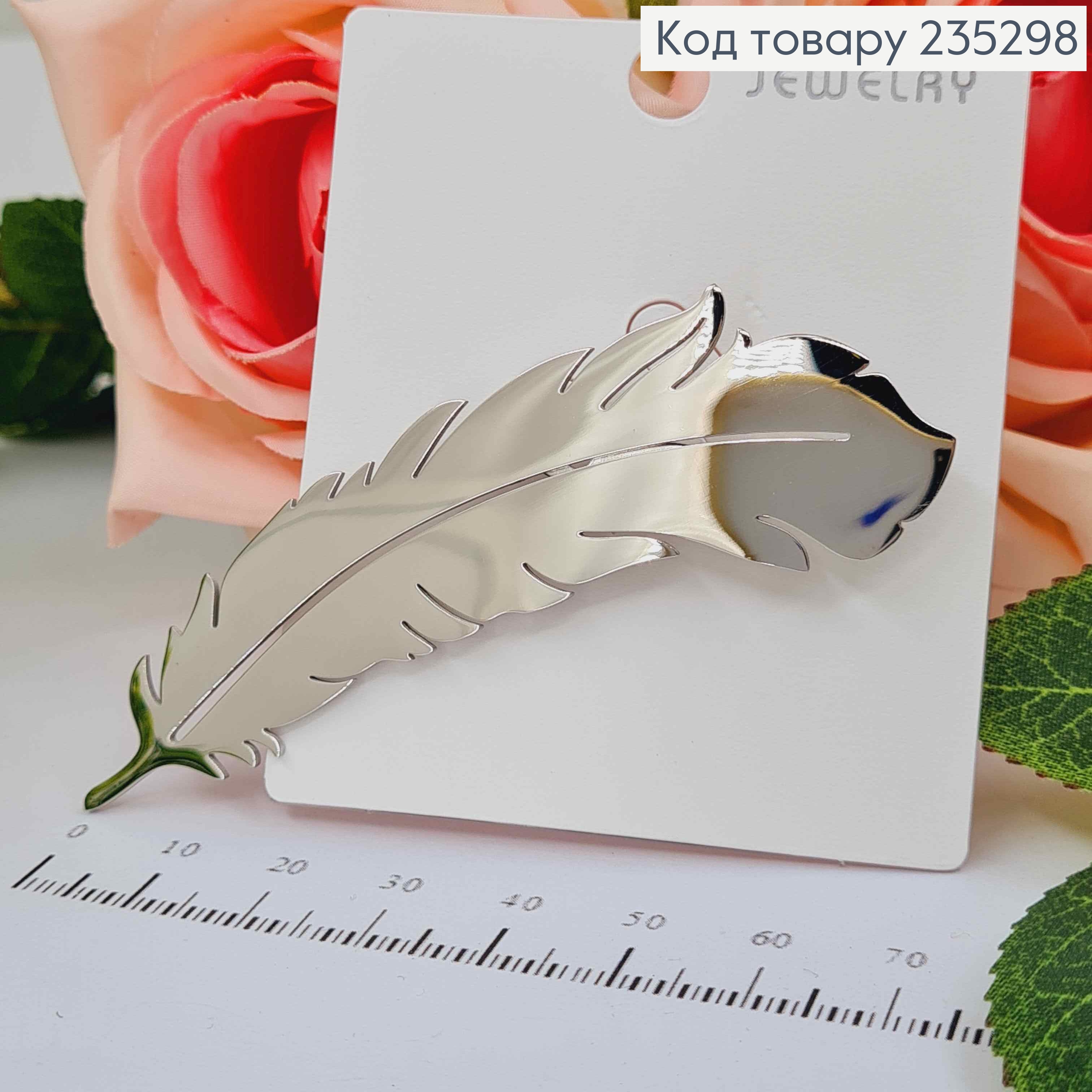 Брошка ПЕРО, срібного кольору, довжиною 8см