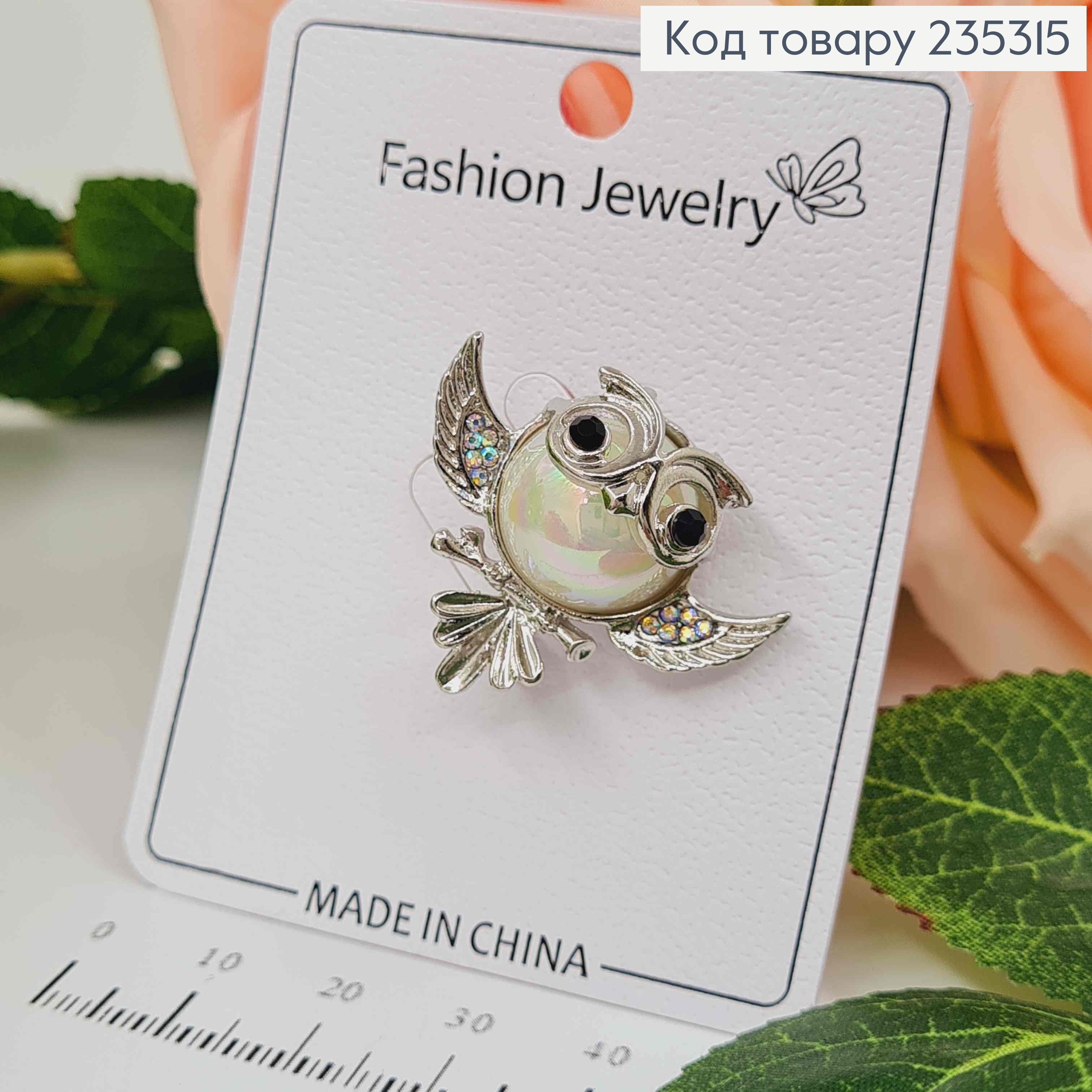 Брошка СОВА з камінцями та бусинкою, СРІБНОГО кольору, 3*2,5см