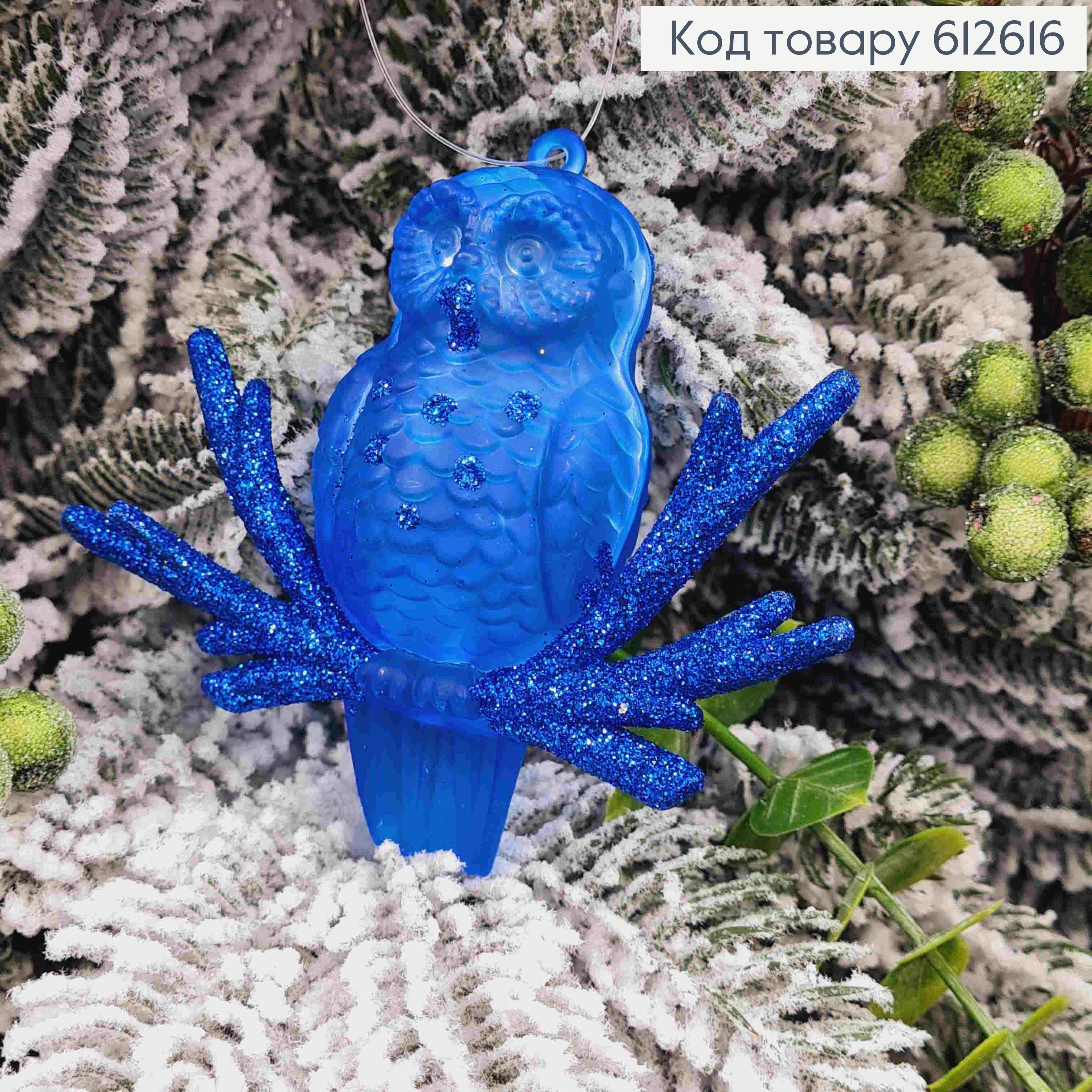 Фігурка СОВА, СИНЯ, матова, 8,5*9см,декорована блиском, новорічна прикраса, пластик, Україна