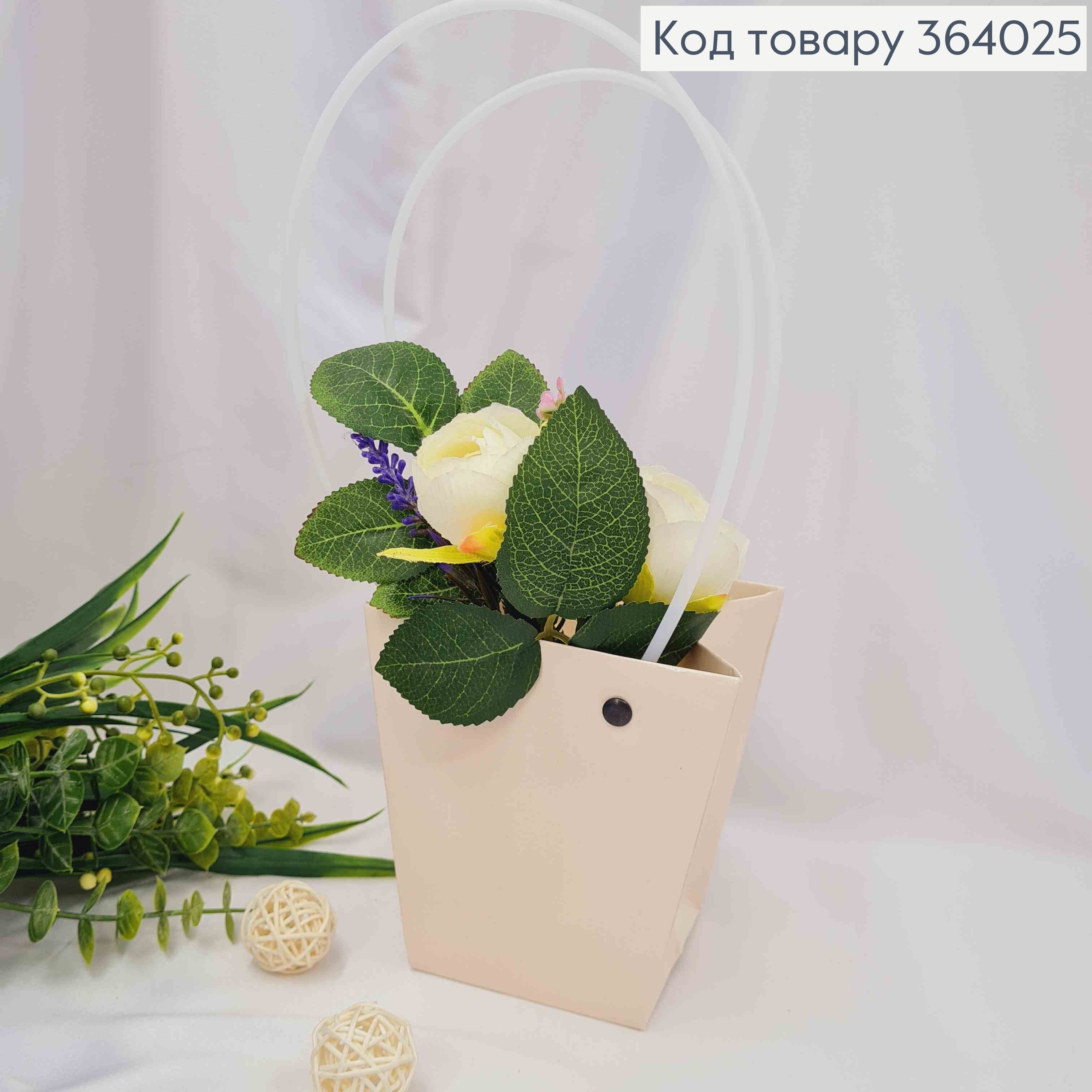 Флористична сумочка глянцева БЕЖЕВА, конусна з пластик. ручками 12*12*12,5см