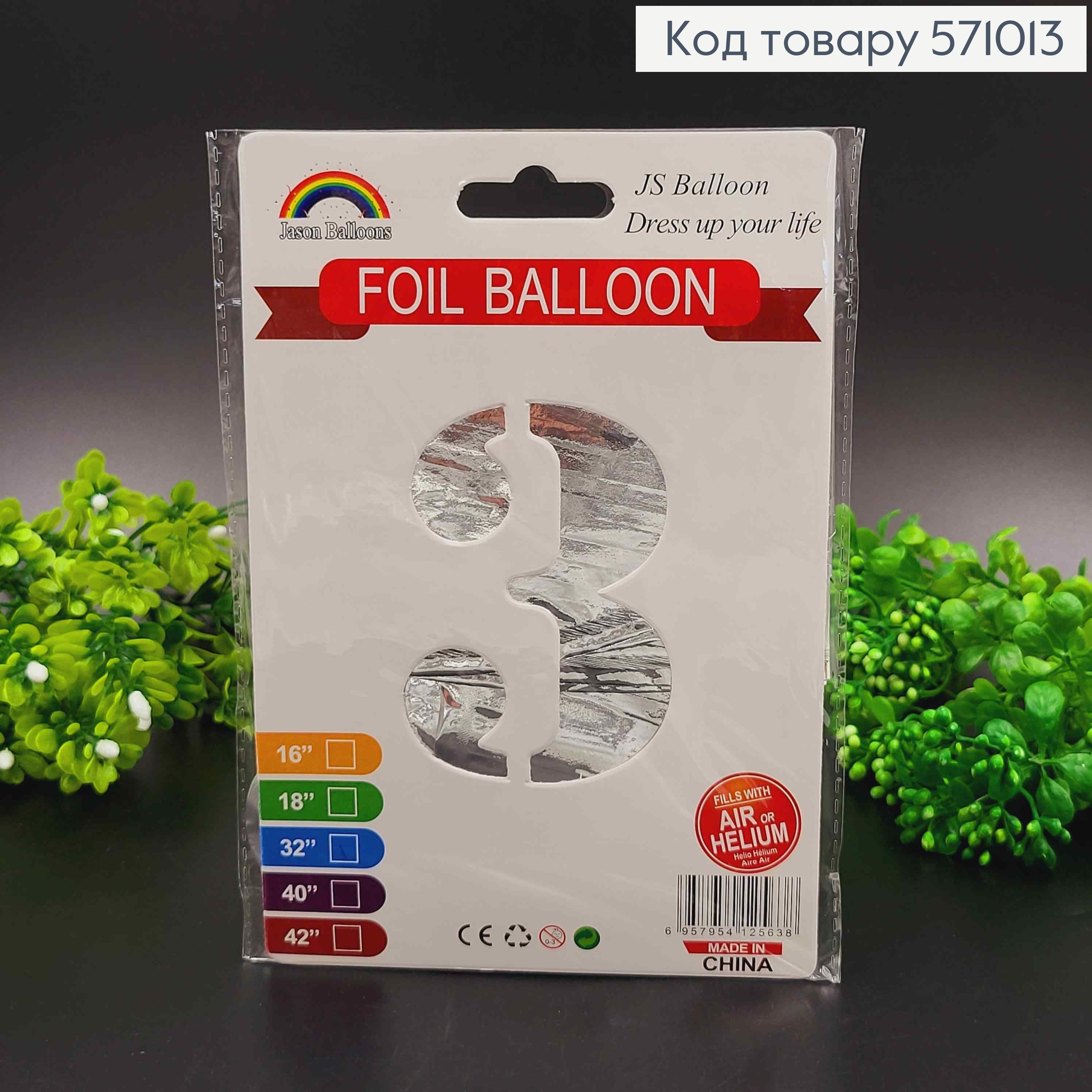 Фольгована надувна ЦИФРА "3" срібного кольору, 32" 76см