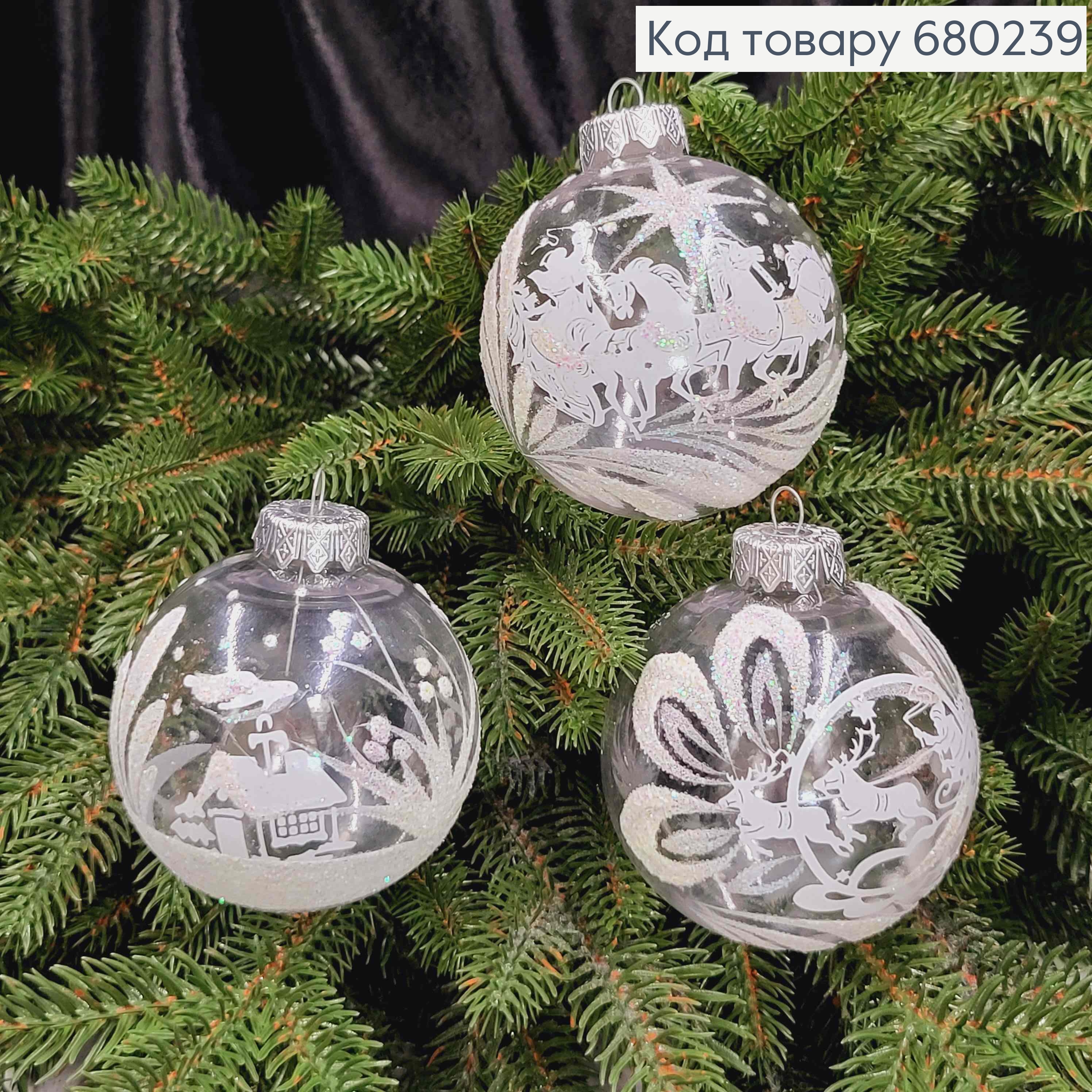 Іграшка куля 80мм ПРОЗОРА з БІЛИМ розписом ручної роботи, ціна за 3шт, Україна