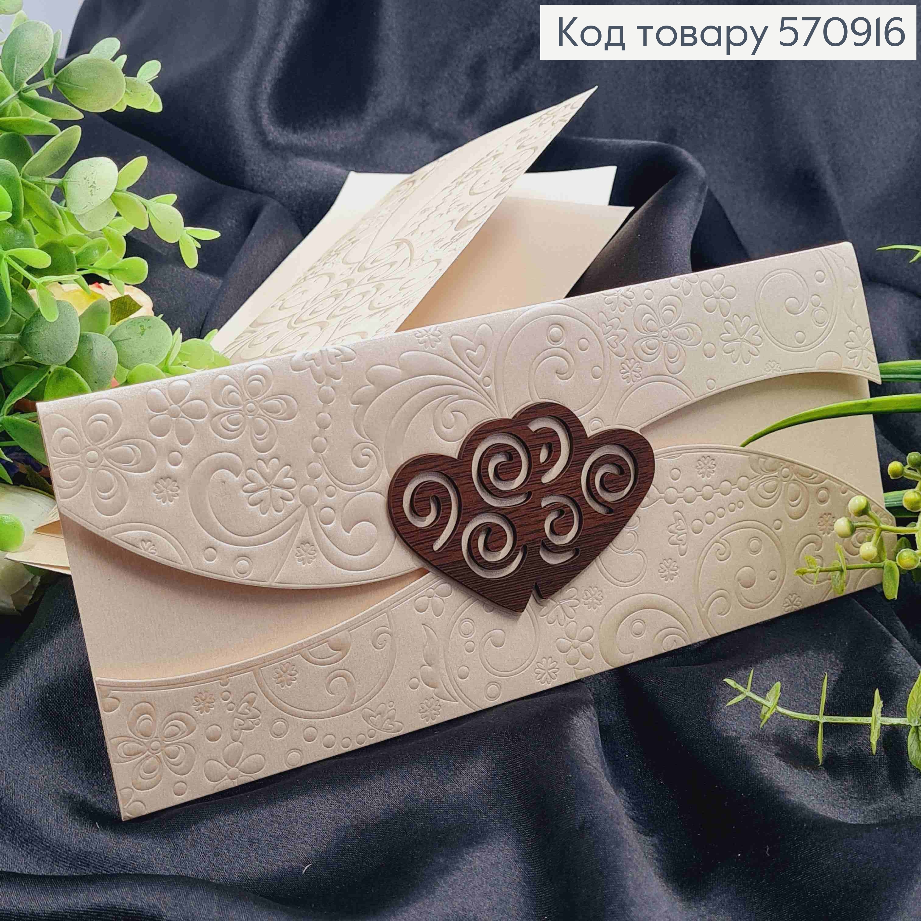 Конверт кольору АЙВОРІ, прикрашений тисненням Квітів + 2 Дерев'яні Серця, 24*10см 570915 фото
