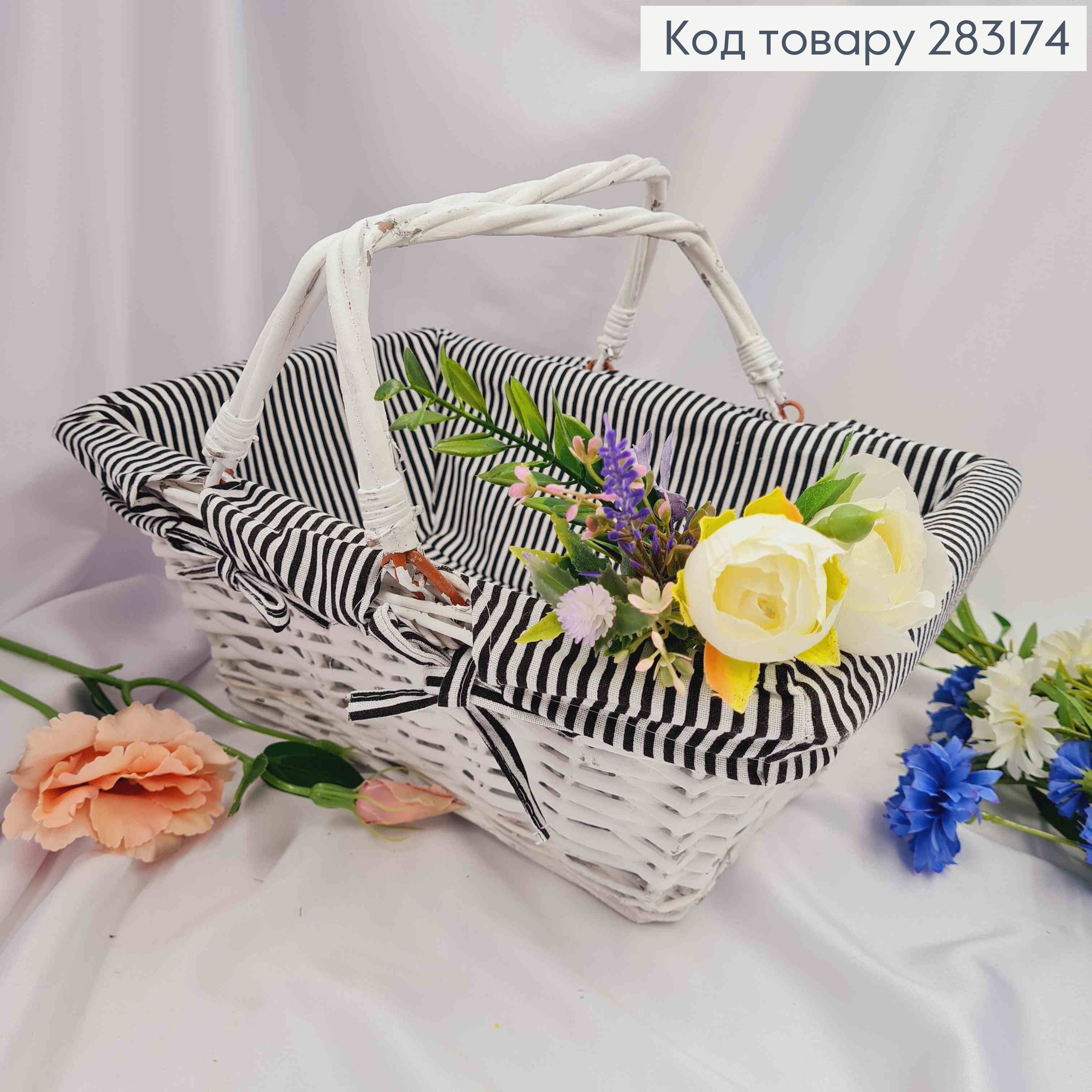 Кошик плетений прямокутний, з Чорно-Білою смугастою тканиною, довжина 35см, ширина 26см, глибна 15см