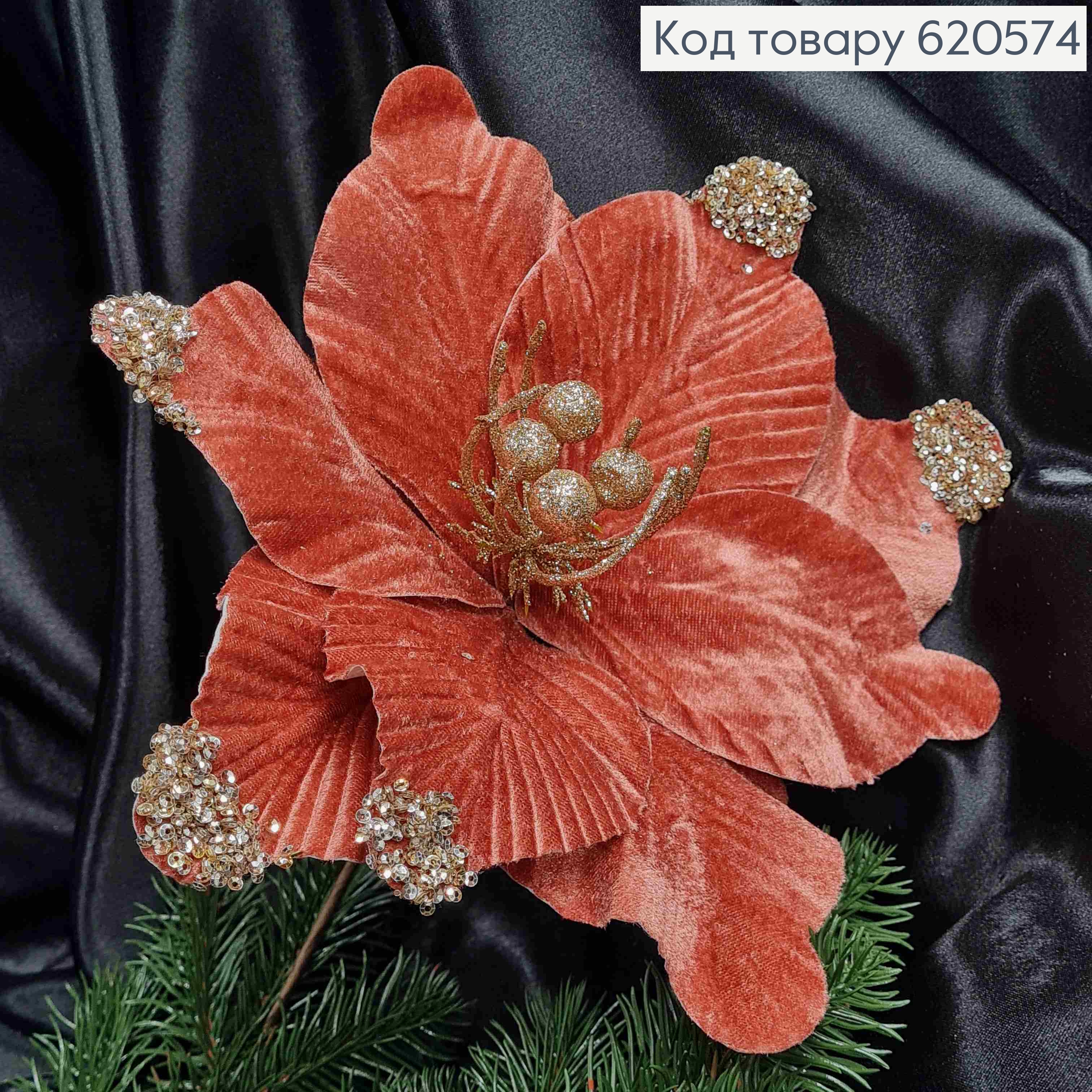 "РІЗДВЯНИК", квітка Пуансетія ЧЕРВОНА+БЛИСК, оксамитова, діам. 20см на метал., довж.22см 620768 фото