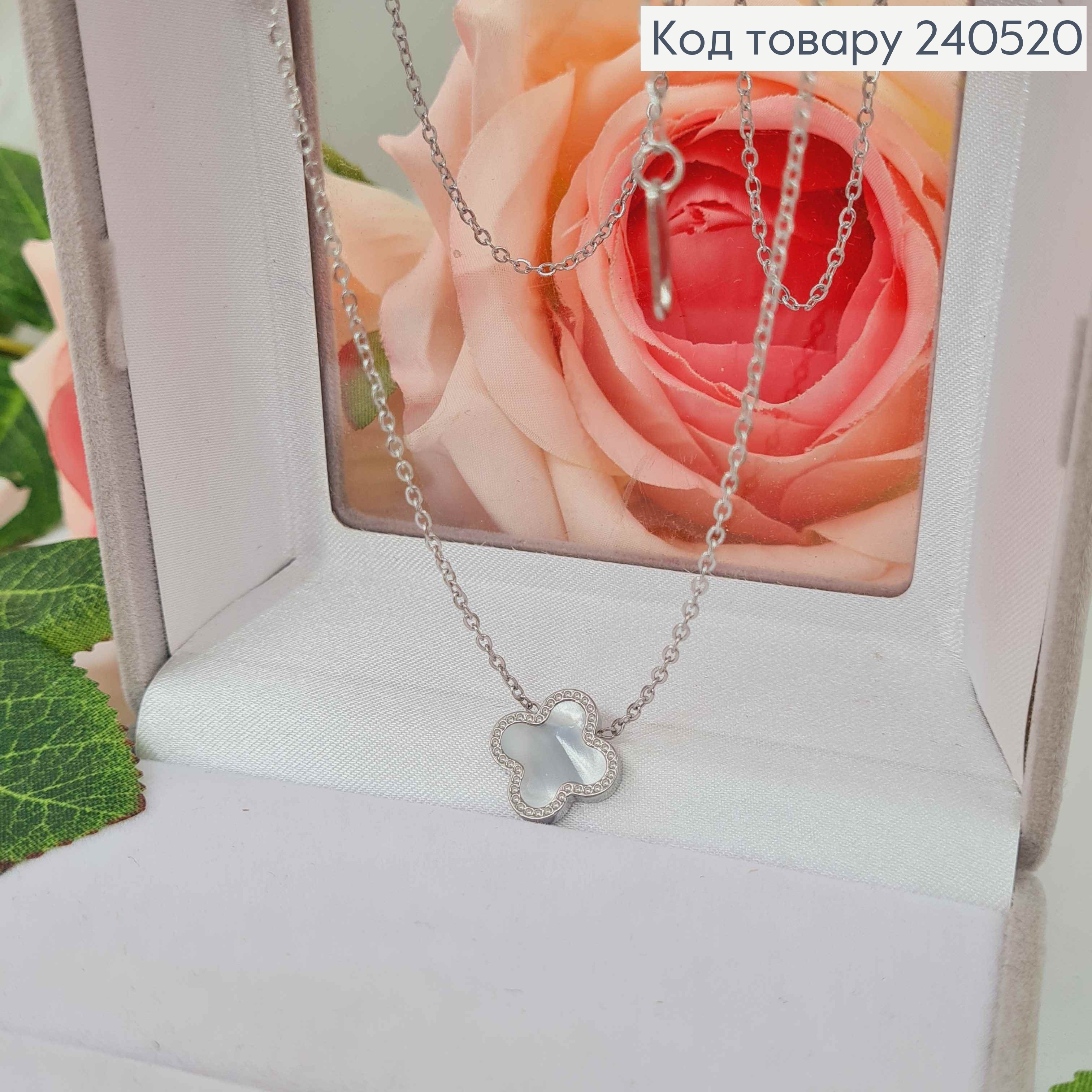 Ланцюжок подвійний, срібного кольору, з підвіскою Van Cleef з білою емаллю, 40+5см, сталь Stainless