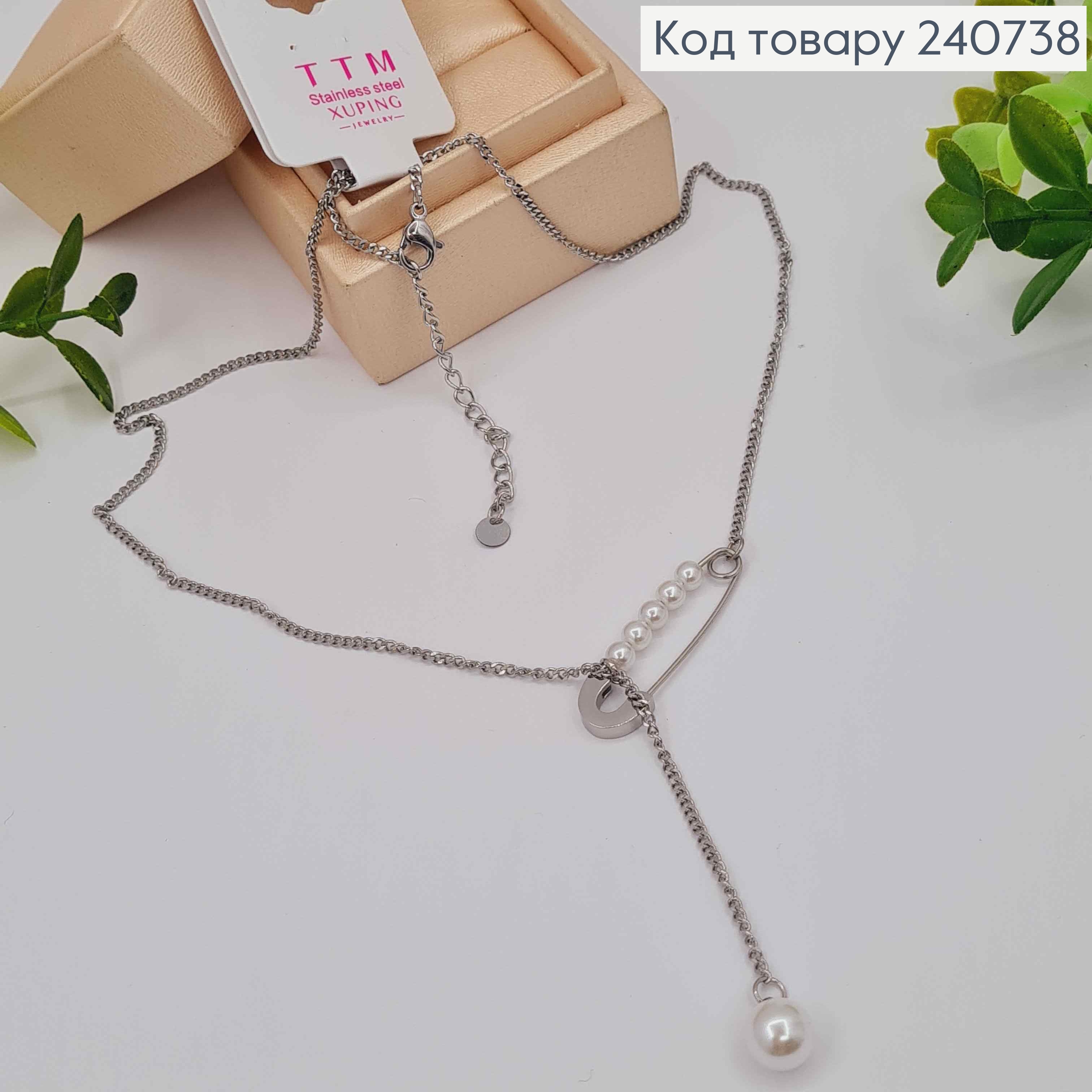 Ланцюжок срібного кольору, з Перлинками та Шпилькою + подовжувач, 44+5см, сталь Stainless Steel