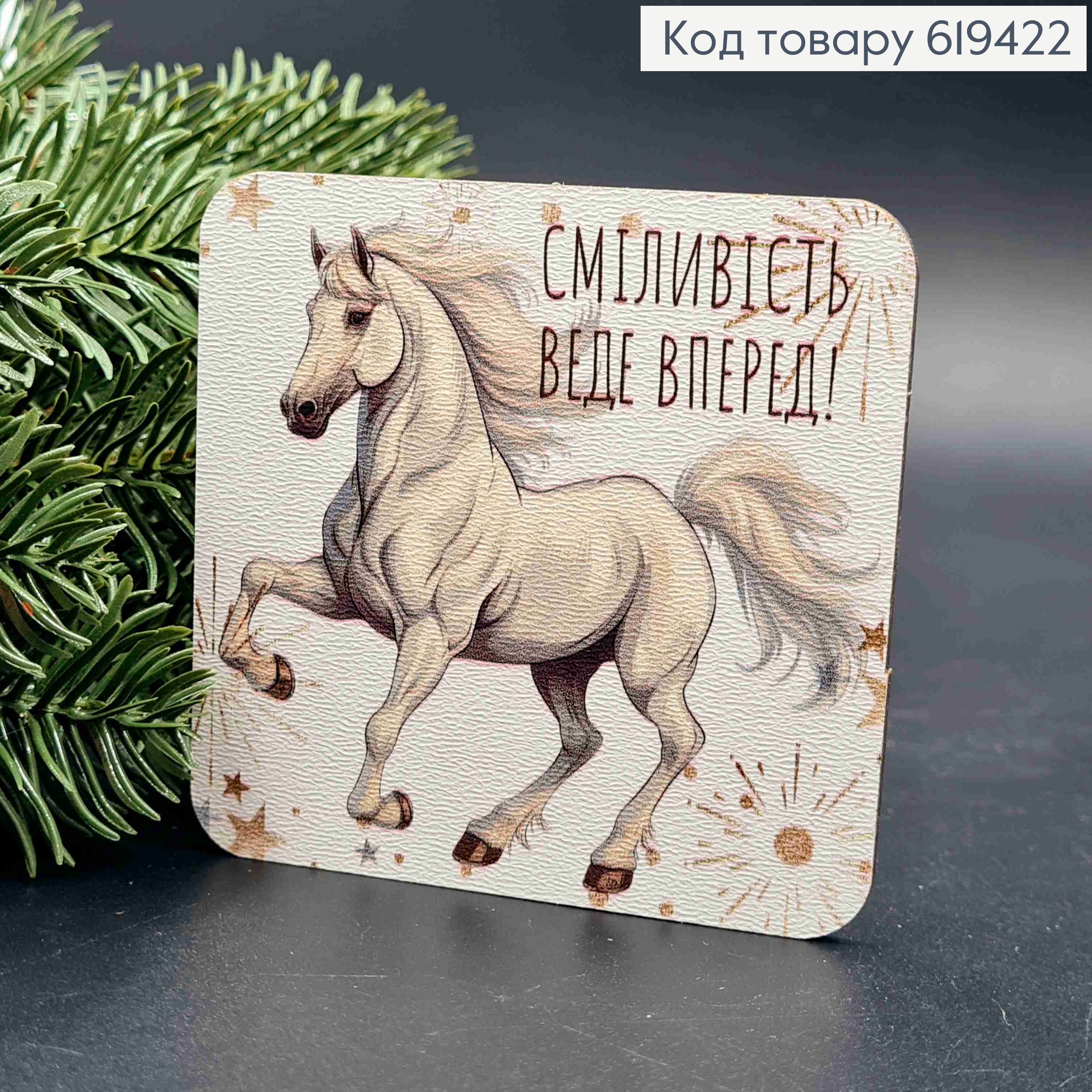 Магніт з дерева з принтом "КІНЬ", "Сміливість веде вперед!!!", 8*8см, ручна робота, Україна