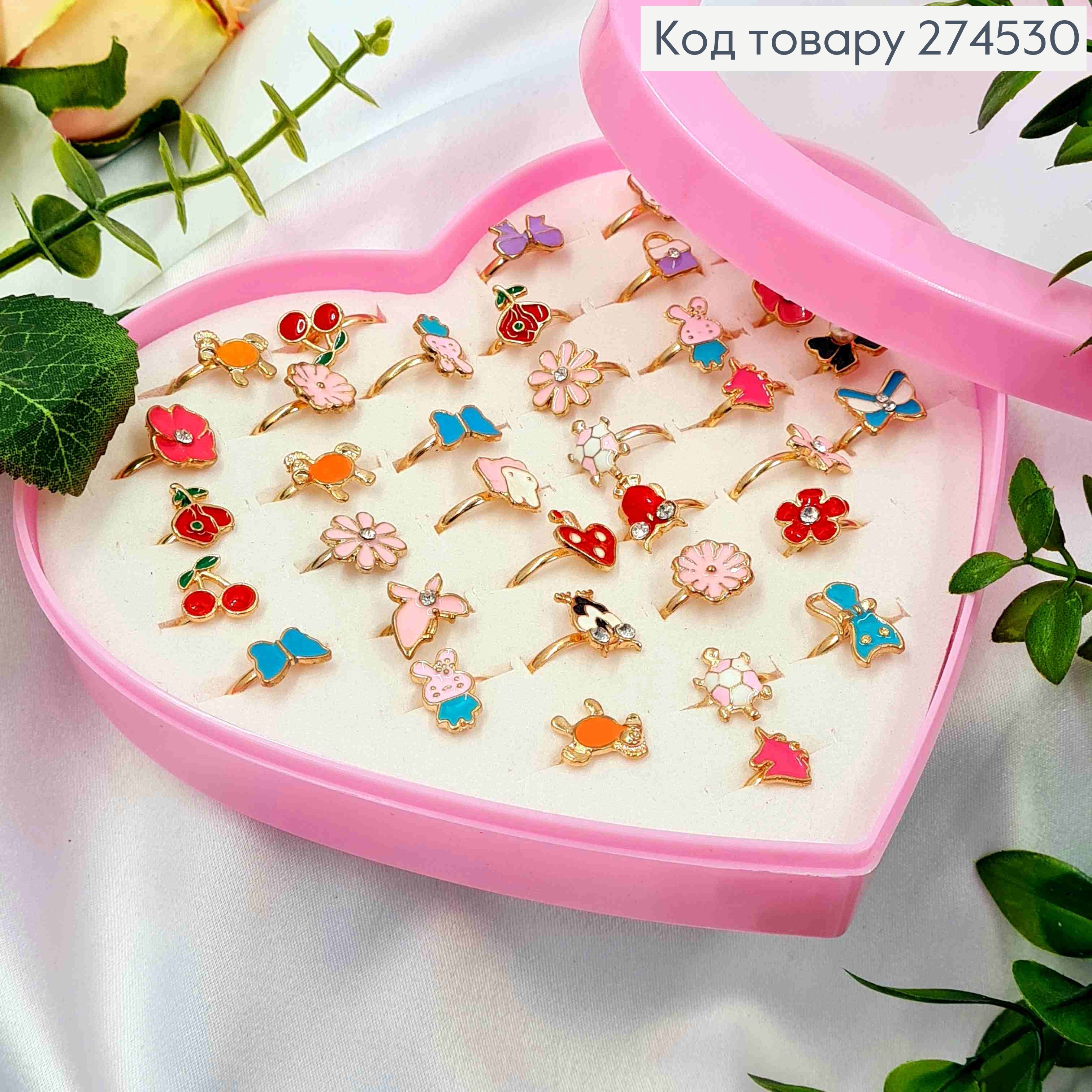 Набір колечок (36шт) фігурки "Квіти-Тваринки-Фрукти" в асортименті в коробочці- сердечку