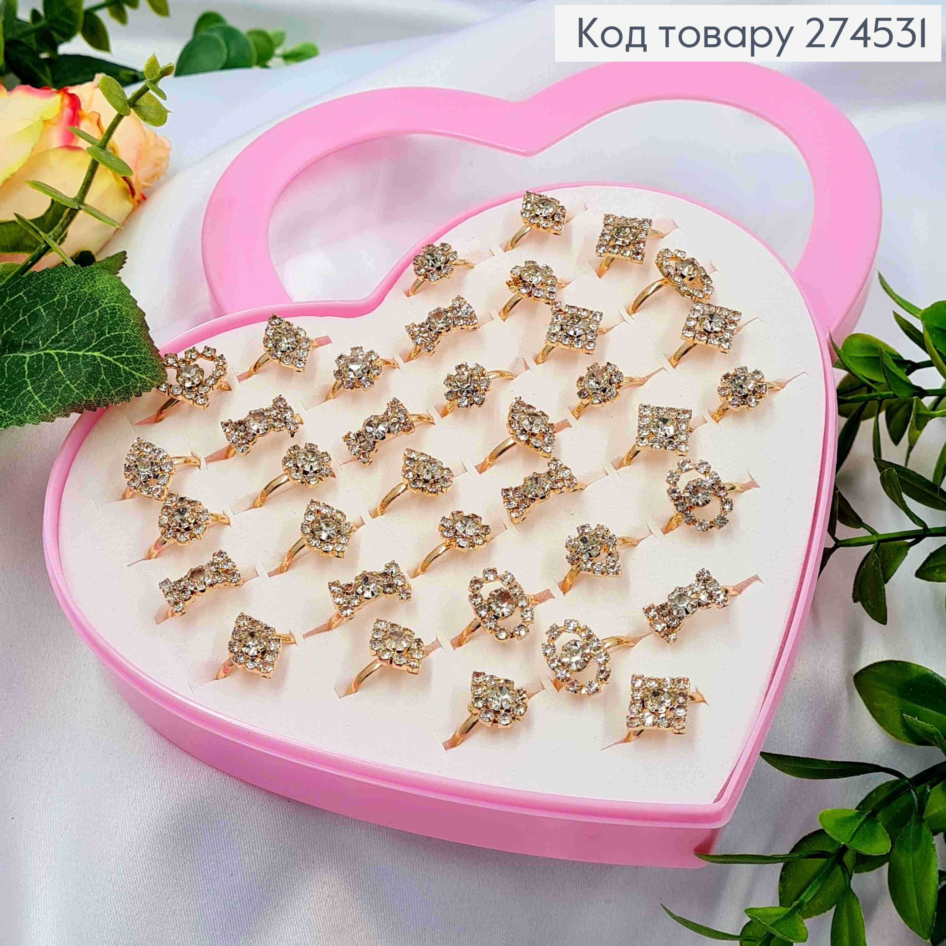 Набір колечок (36шт) "Вишукані фігурки" в Блискучих камінцях в асортименті в коробочці- сердечку