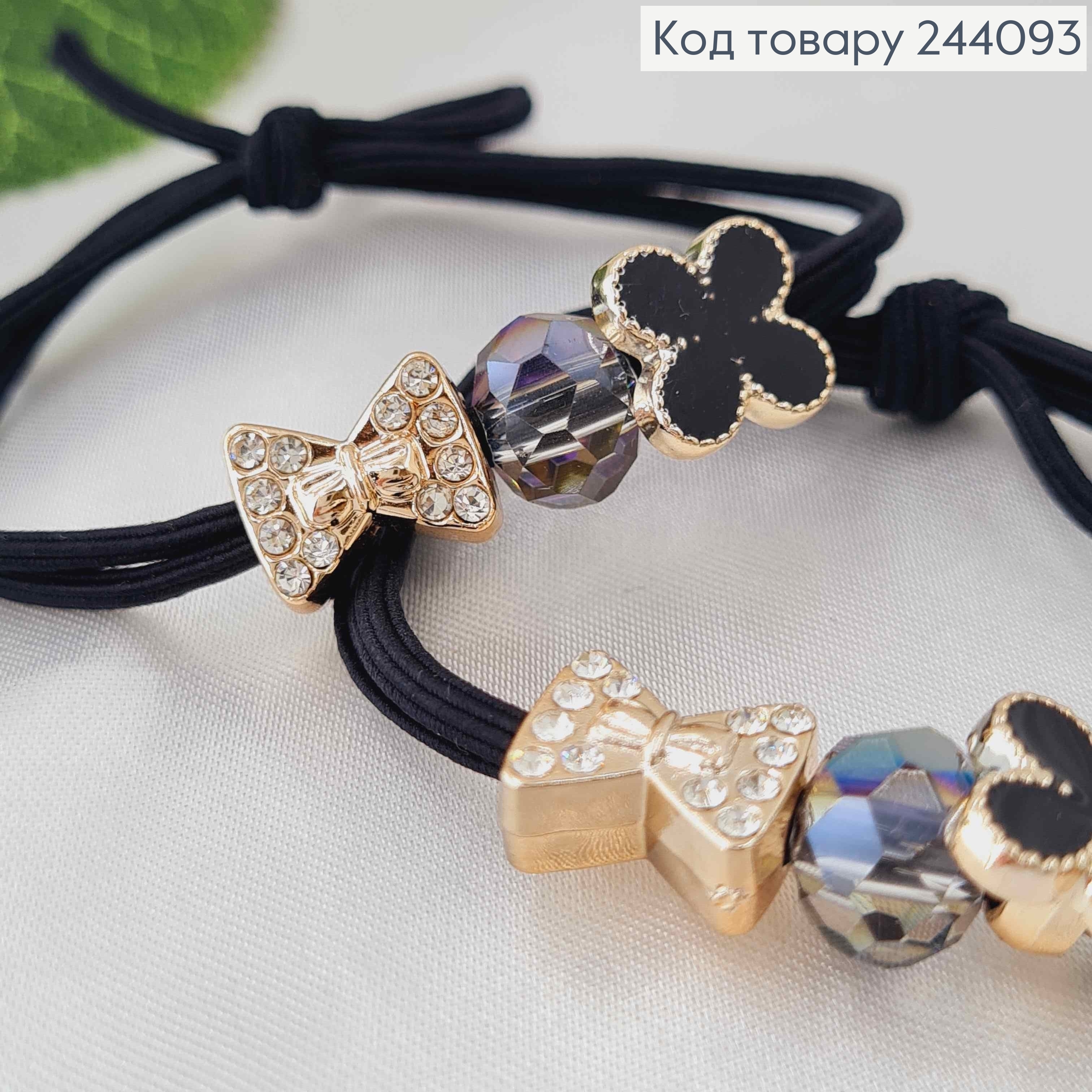 Резинка, чорна з бантиками, бусинками та чотирилисниками