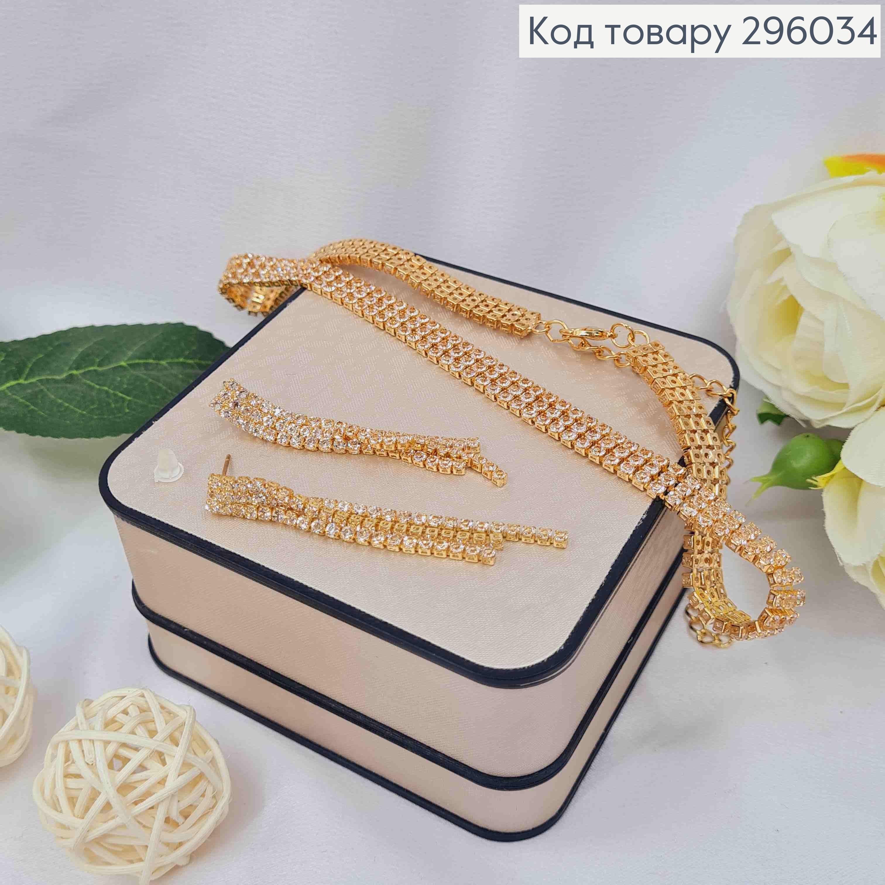 Набір: Сережки гвіздки та Кольє-чокер з Блискучими камінцями, дов30+10см,шир.1,5см, Золотого кольору 296030 фото