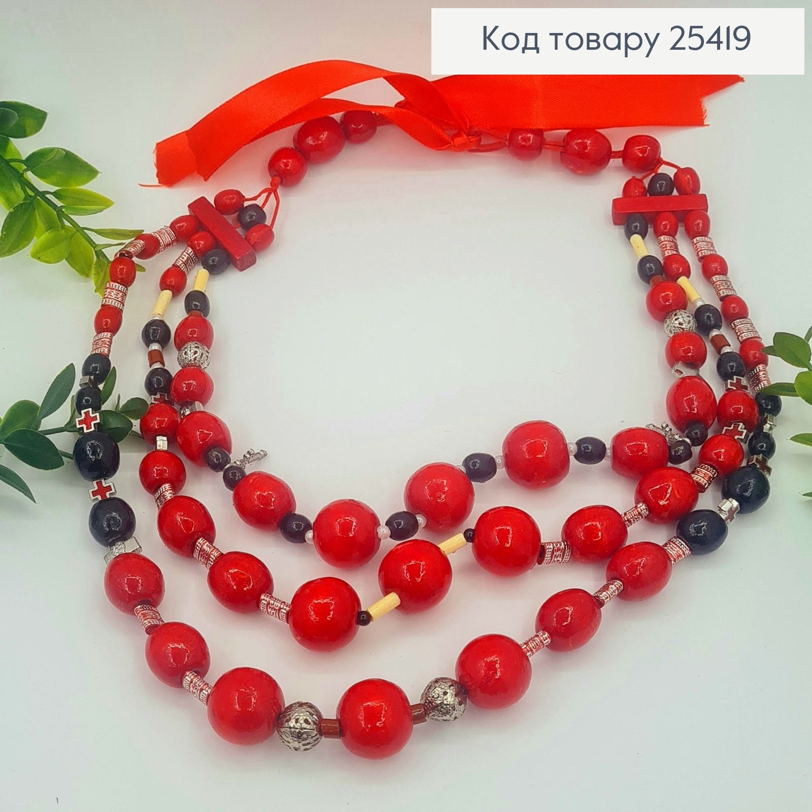 Намисто дерев'яне, ЧЕРВОНОГО кольору з Китичками, 65см, ручна робота 25414 фото