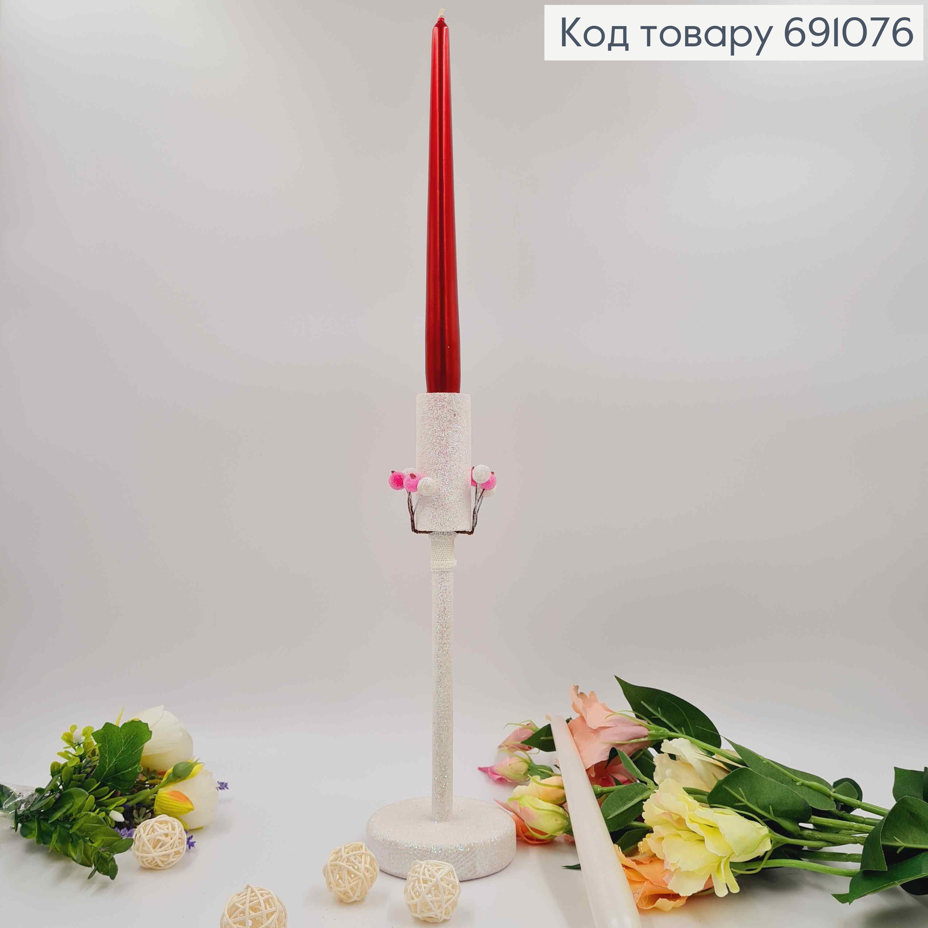 Підсвічник дерев'яний, блиск білого кольору, декорований ягодами, висота 28см, підставка 9см