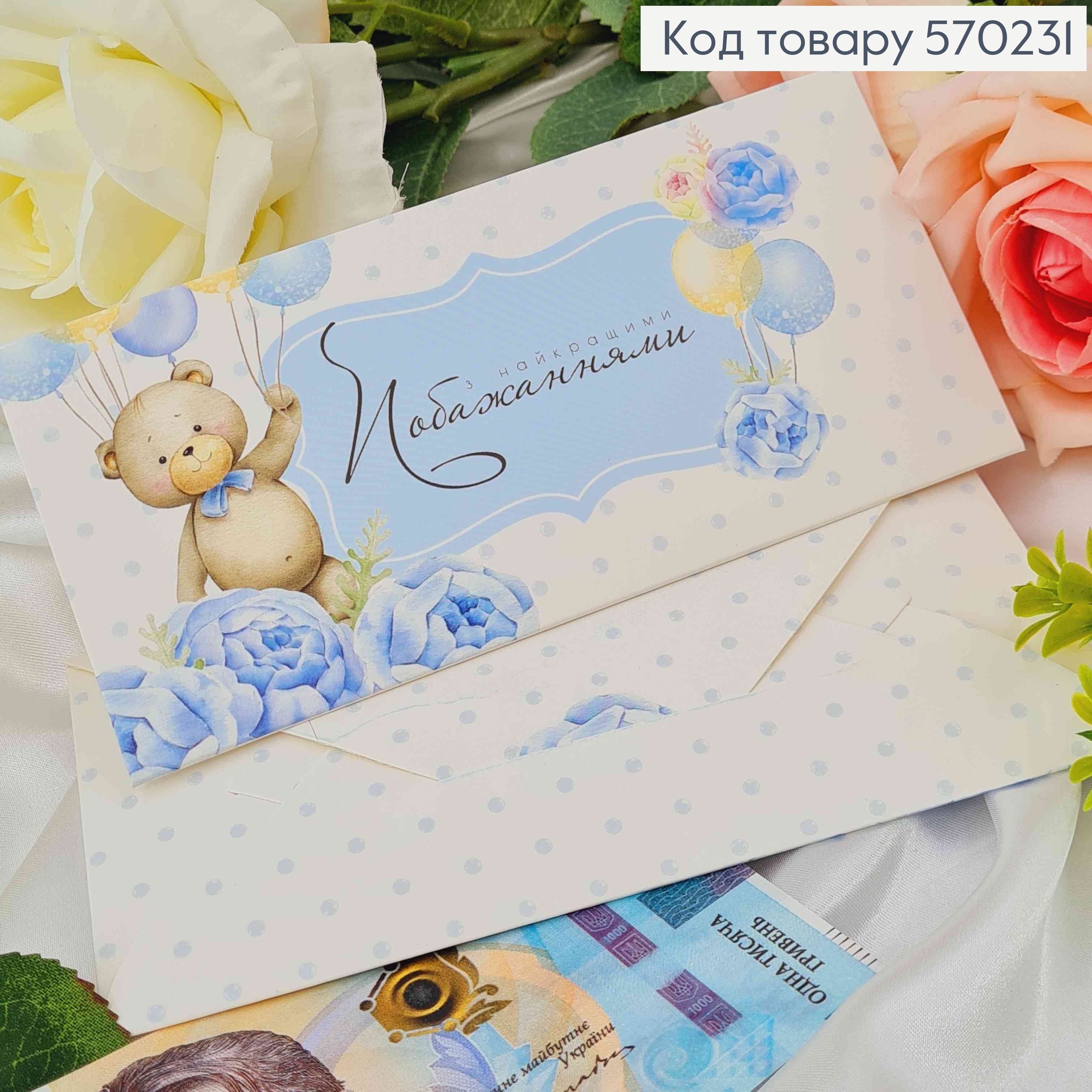 Подарунковий конверт "З найкращими побажаннями" (блакитний) 8*16,5см , ціна за 1шт, Україна