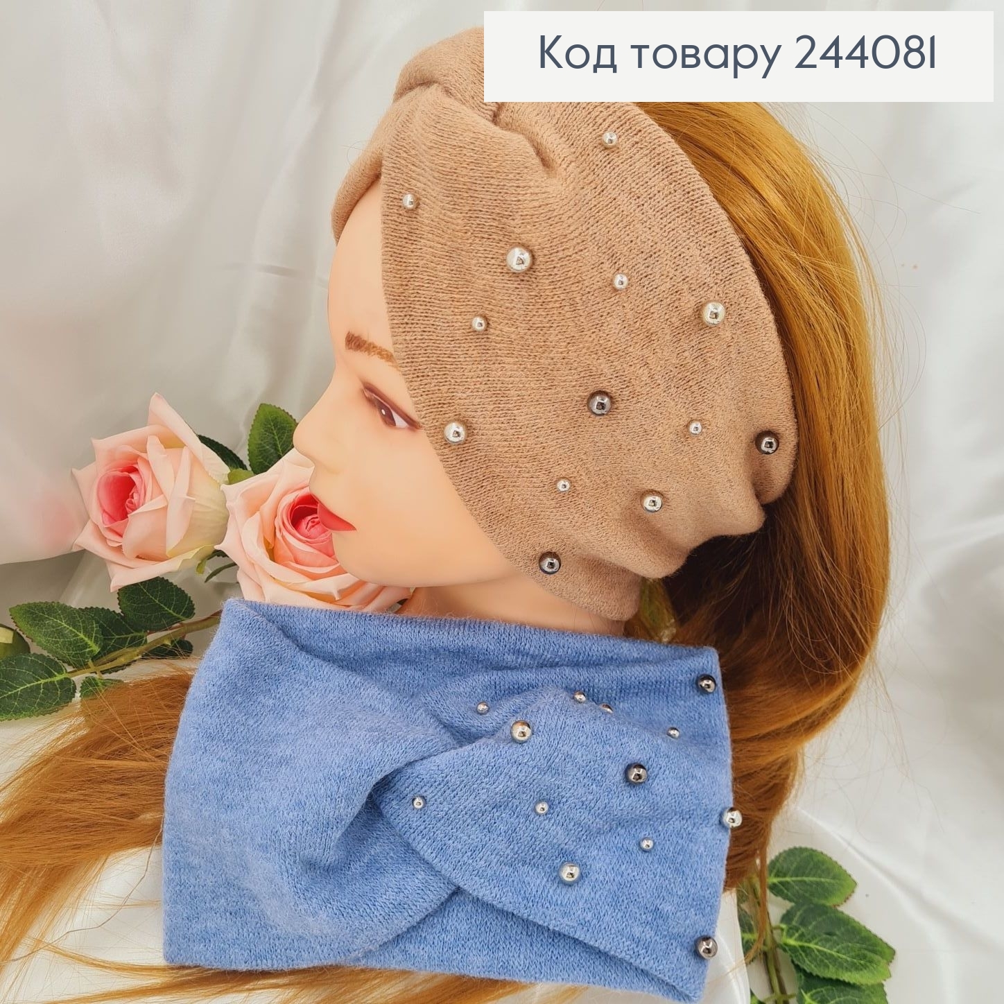 Пов'язка Ангора з бусинками БЛАКИТНА 19*14см, Україна