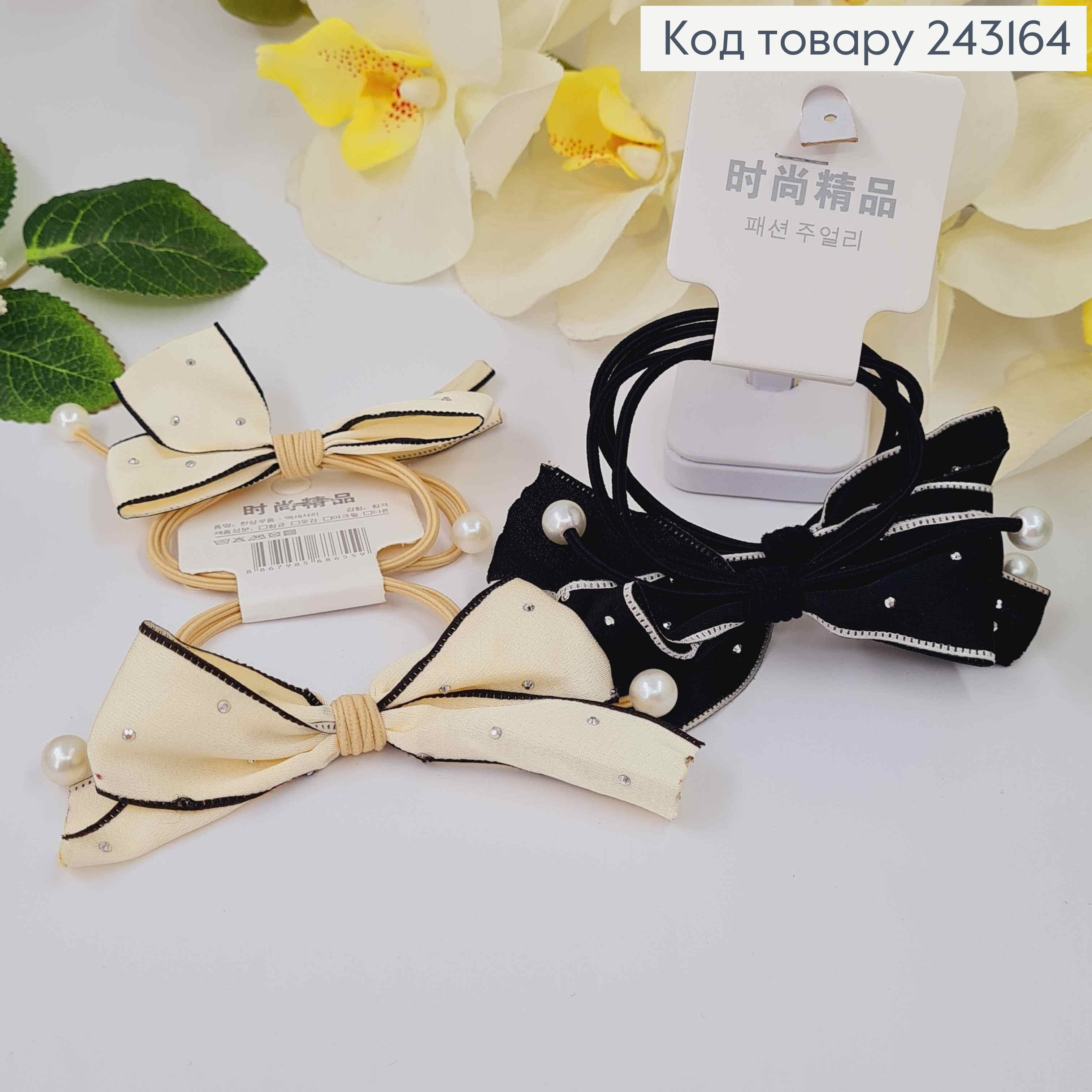 Резинка шнурочок, Бантик з камінцями та перлинками, 5см, чорного/молочного кольору, 2шт/наб.