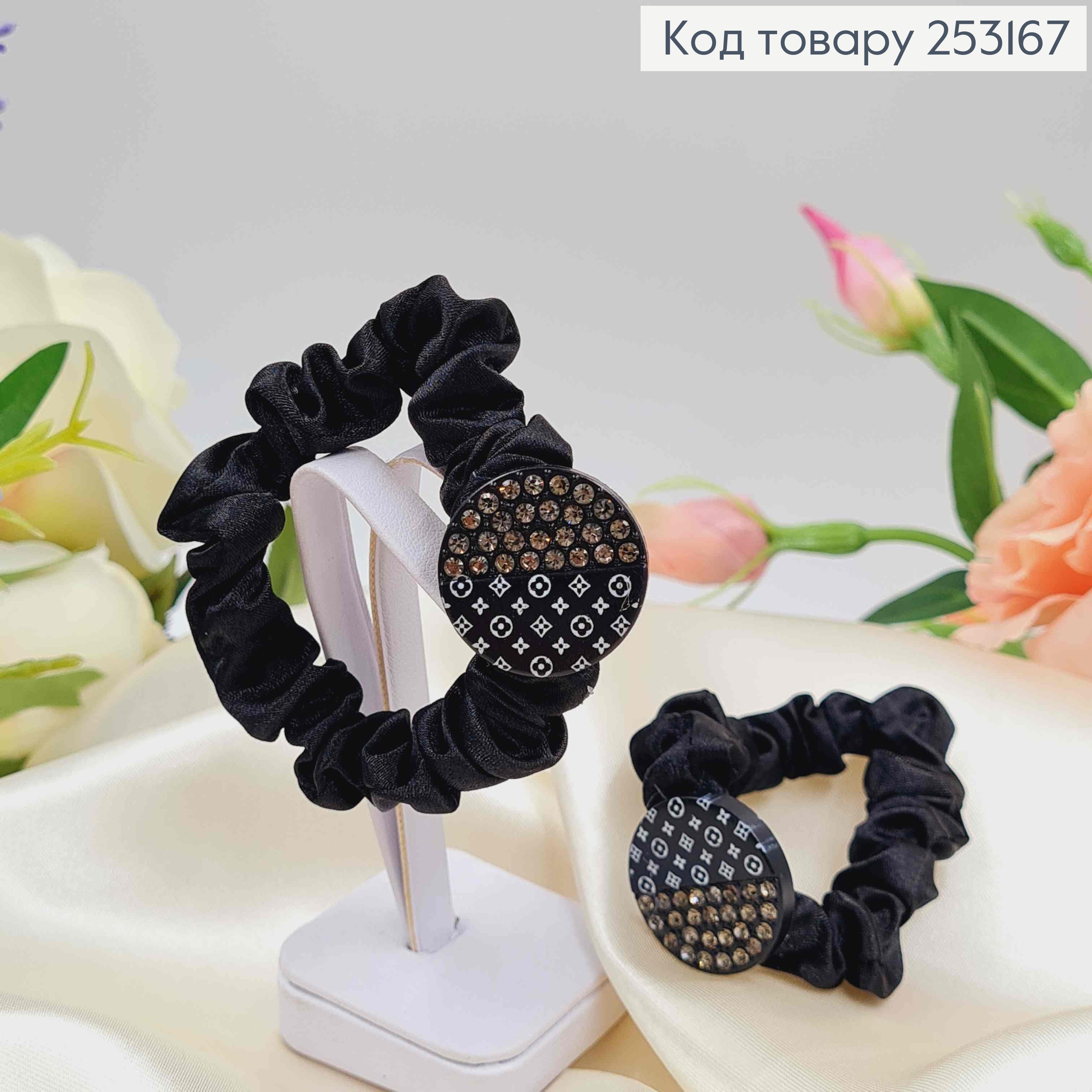 Резинка жатка 6см, Чорного кольору, з круглою пластинкою "Луї Вітон" з камінцями