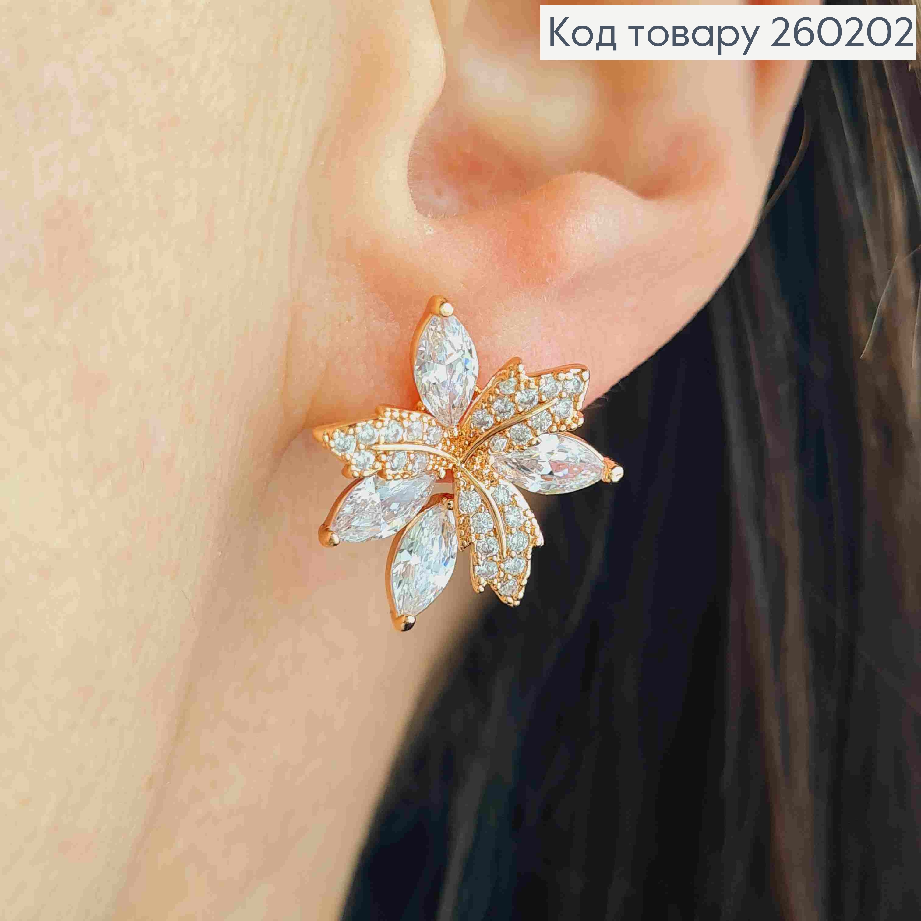 Сережки гвіздки золотого кольору, "Кленове листя" в камінцях (1,8см),сталь XianGuang