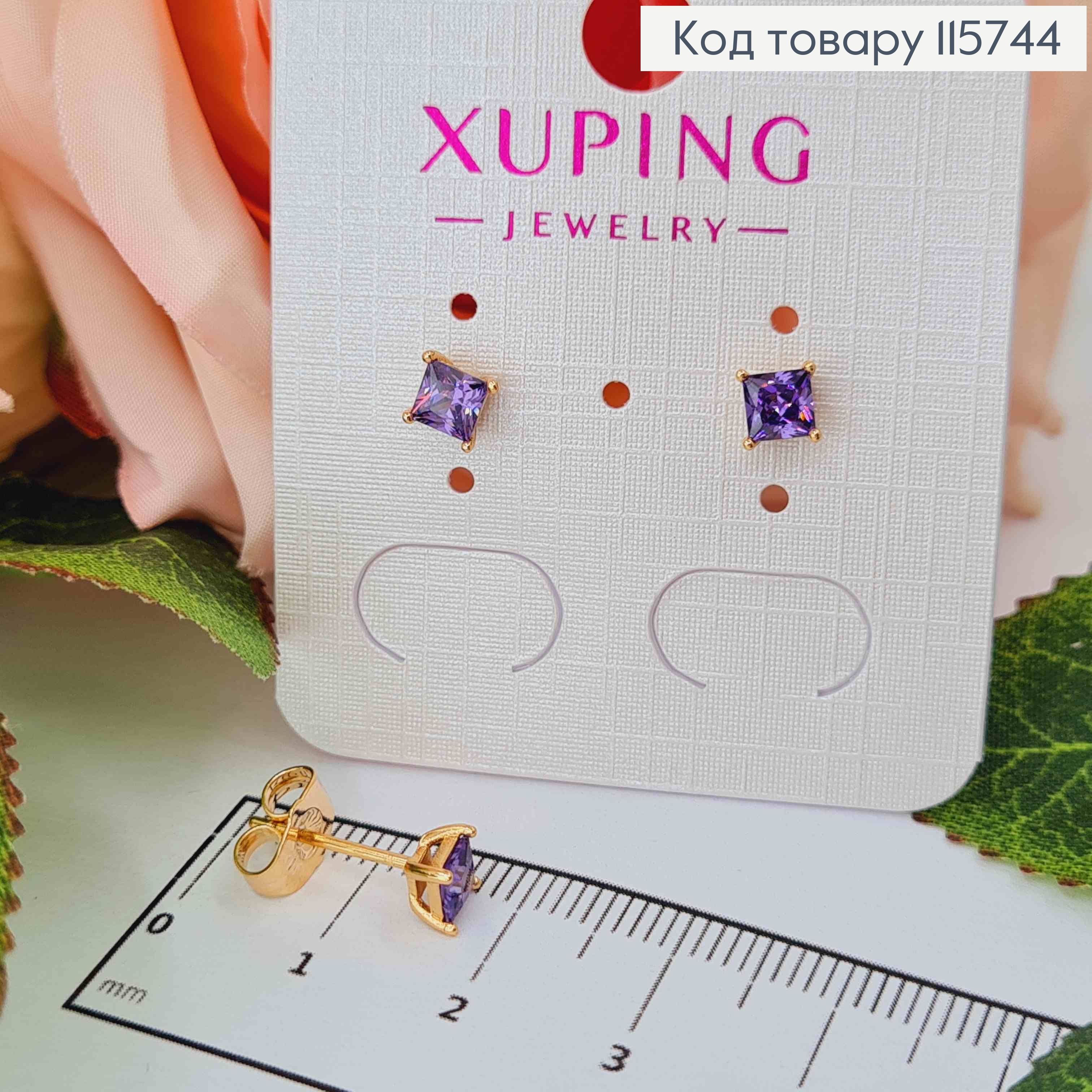 Сережки гвоздики, з ЛІЛОВИМ квадратним каменем, 4мм. Xuping 18K