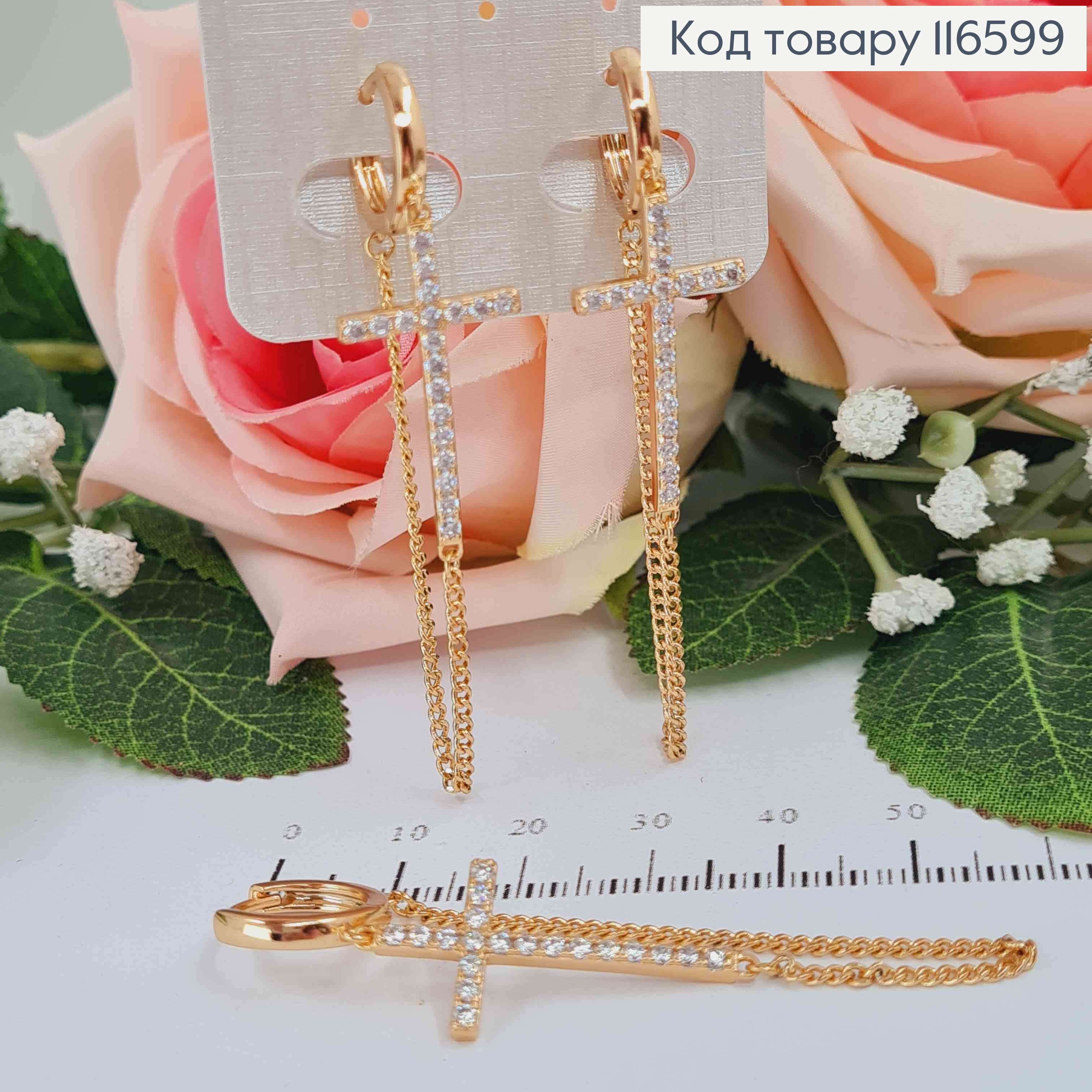 Сережки кільця 1см, з підвісками Хрестиками в камінцях, з ланцюжками, 2,7*1,5см, Xuping 18K