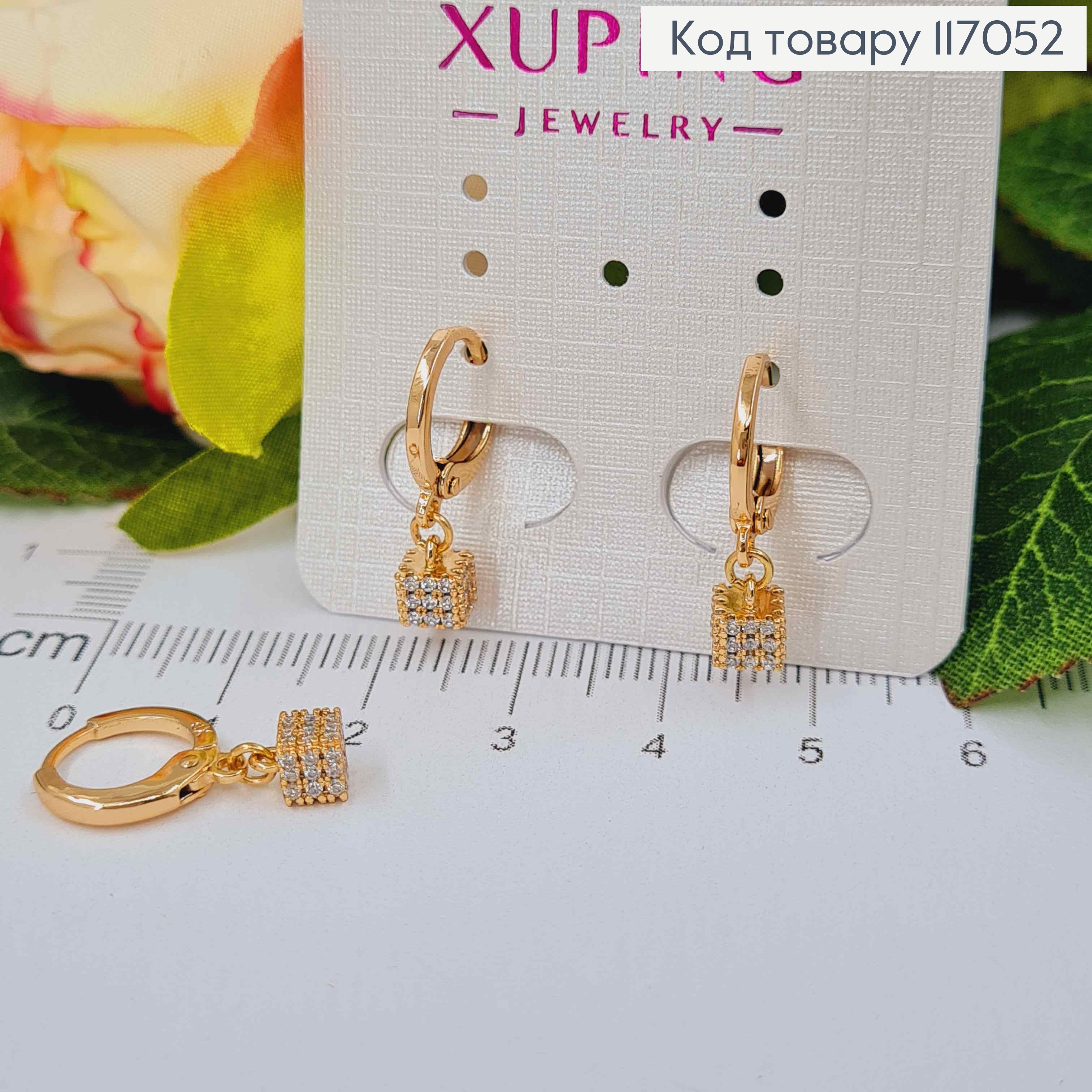 Сережки кільця 1см, з підвіскою Кубиком в камінцях, Xuping 18K