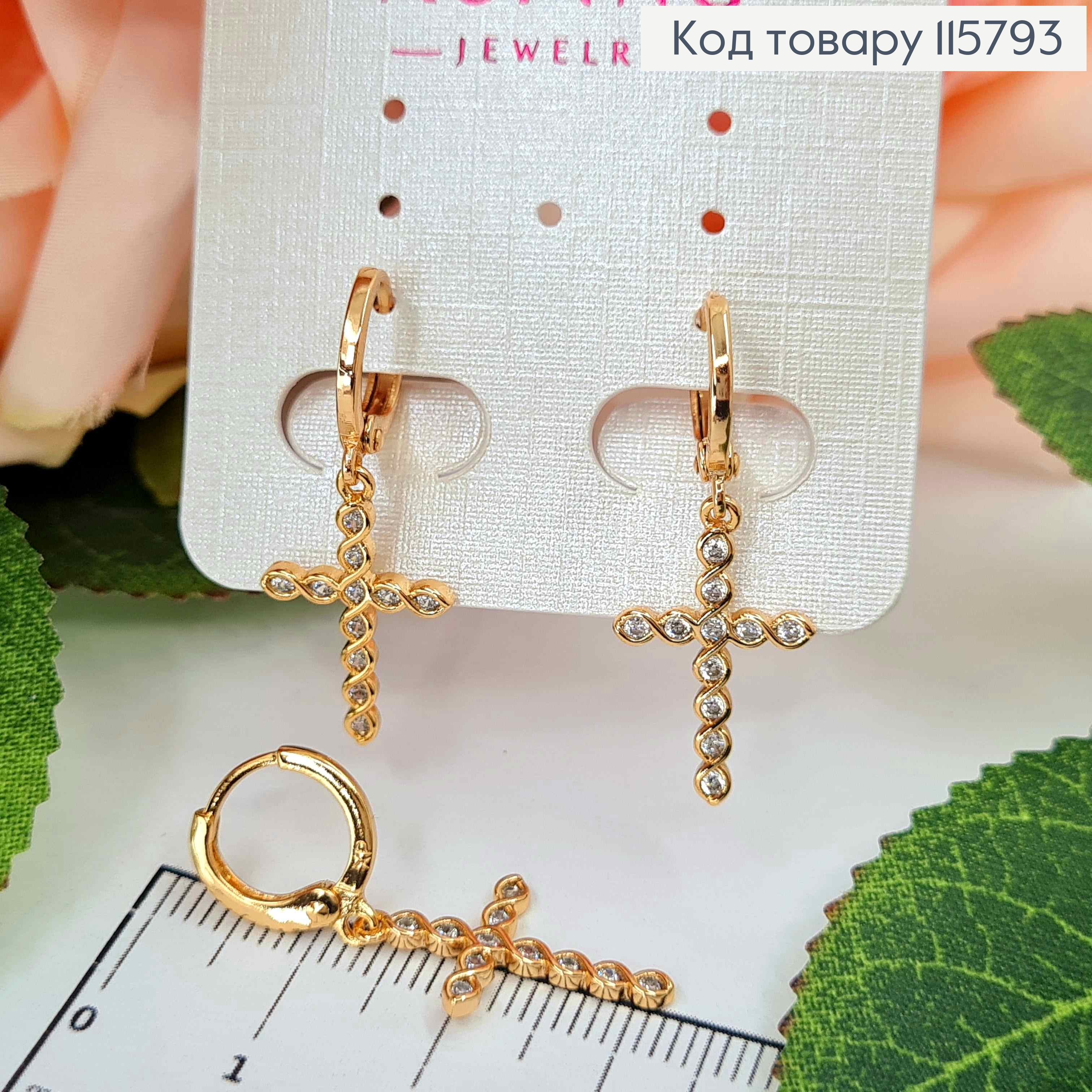 Сережки кільця 1см, з підвіскою переплетеним хрестиком, з камінцями, 2см, Xuping 18K