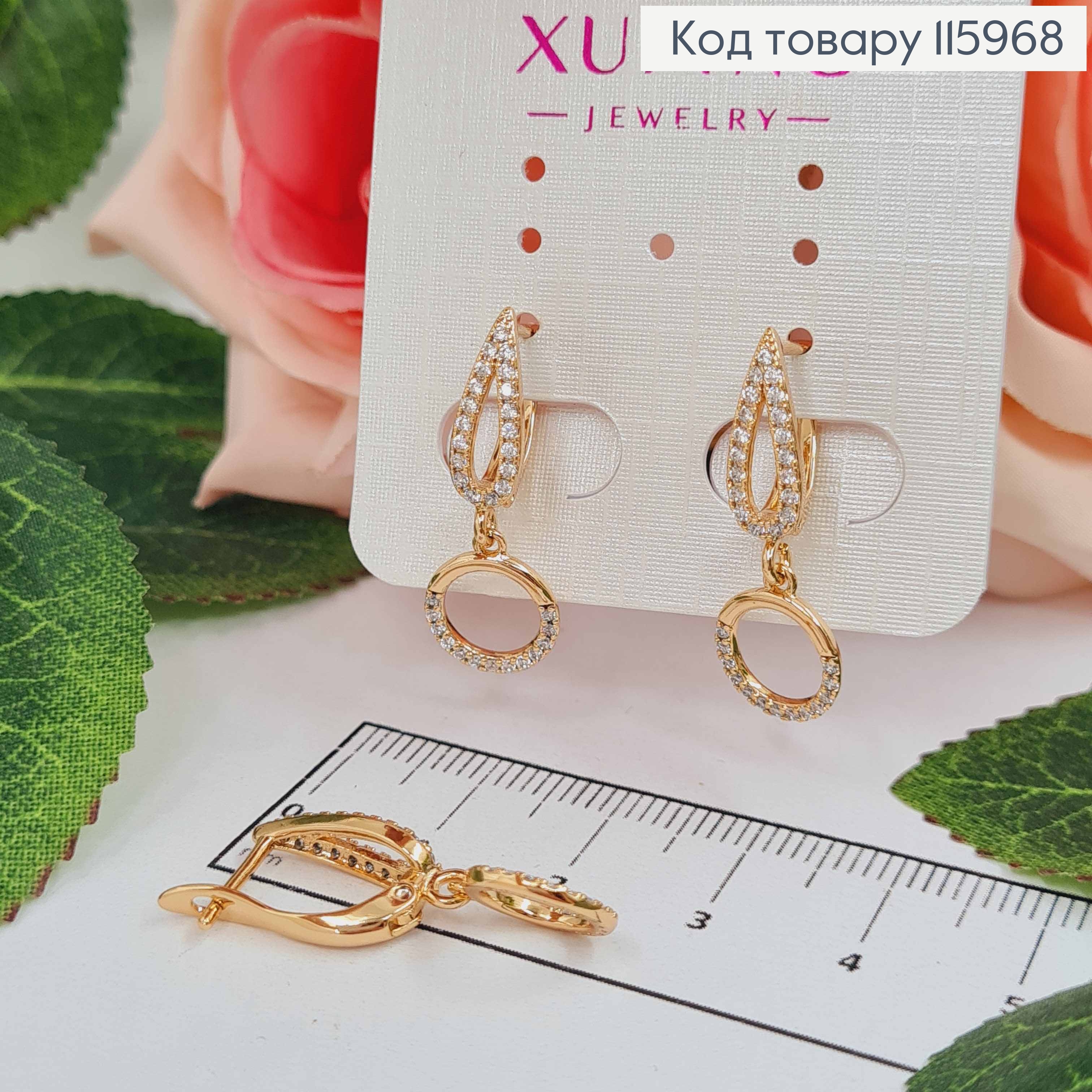 Сережки Пелюсточка в камінцях, з підвіскою колечком, 2,5см, Xuping 18K