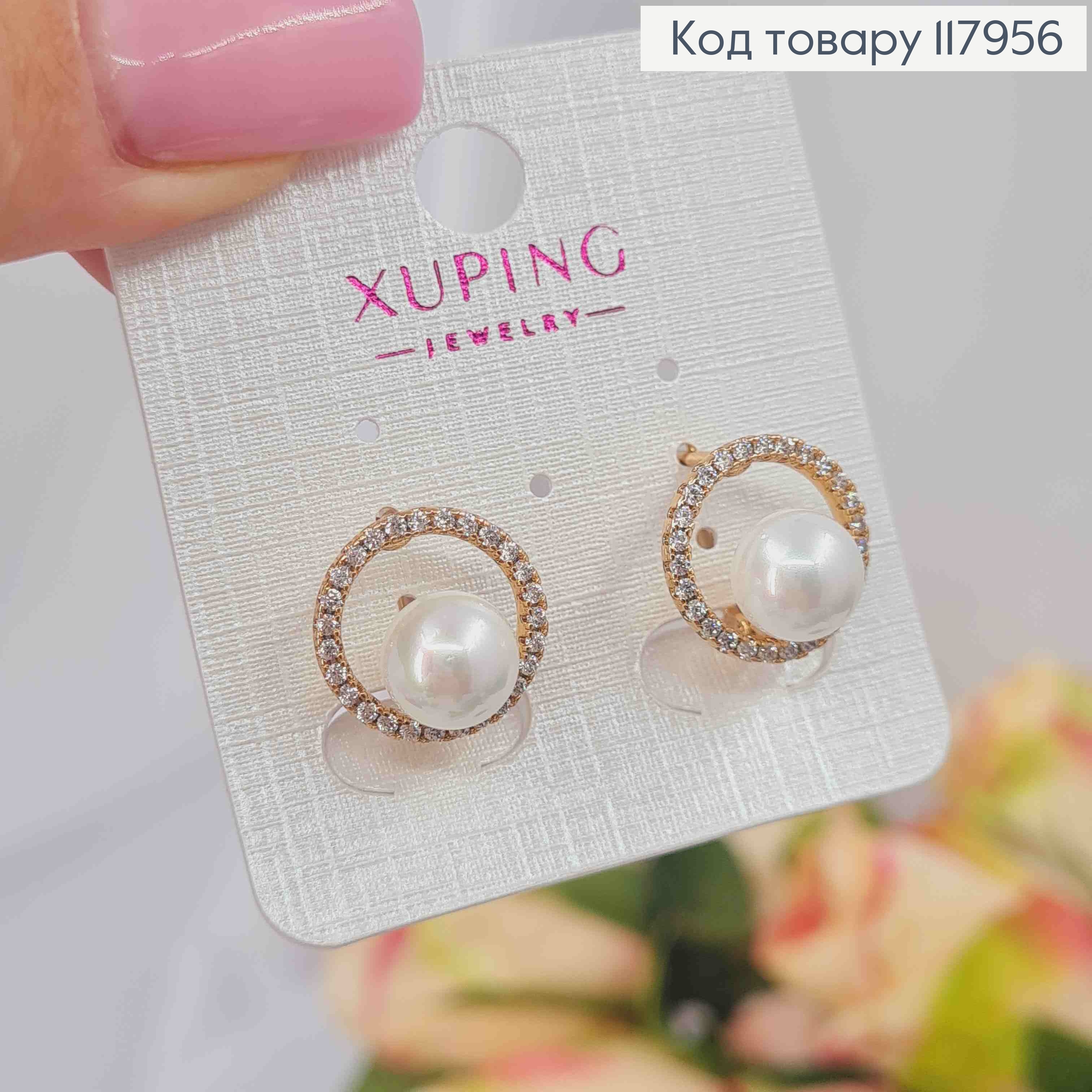 Сережки, Перлинка в колі з камінців, 1,4см, англійська застібка, Xuping 18K