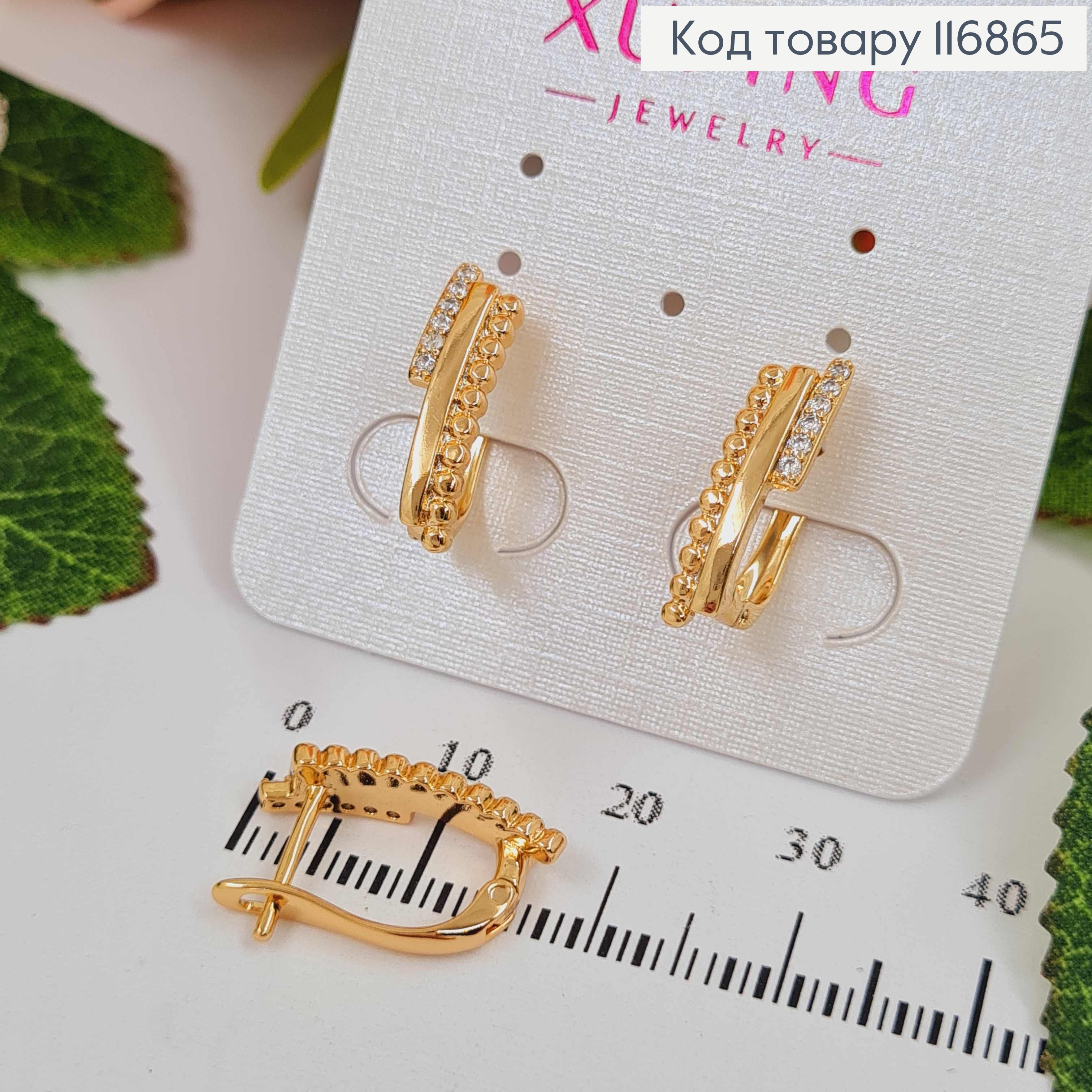 Сережки пластинки, "Три лінії" з кульками та камінцями, 1,6см, англ.заст. Xuping 18К
