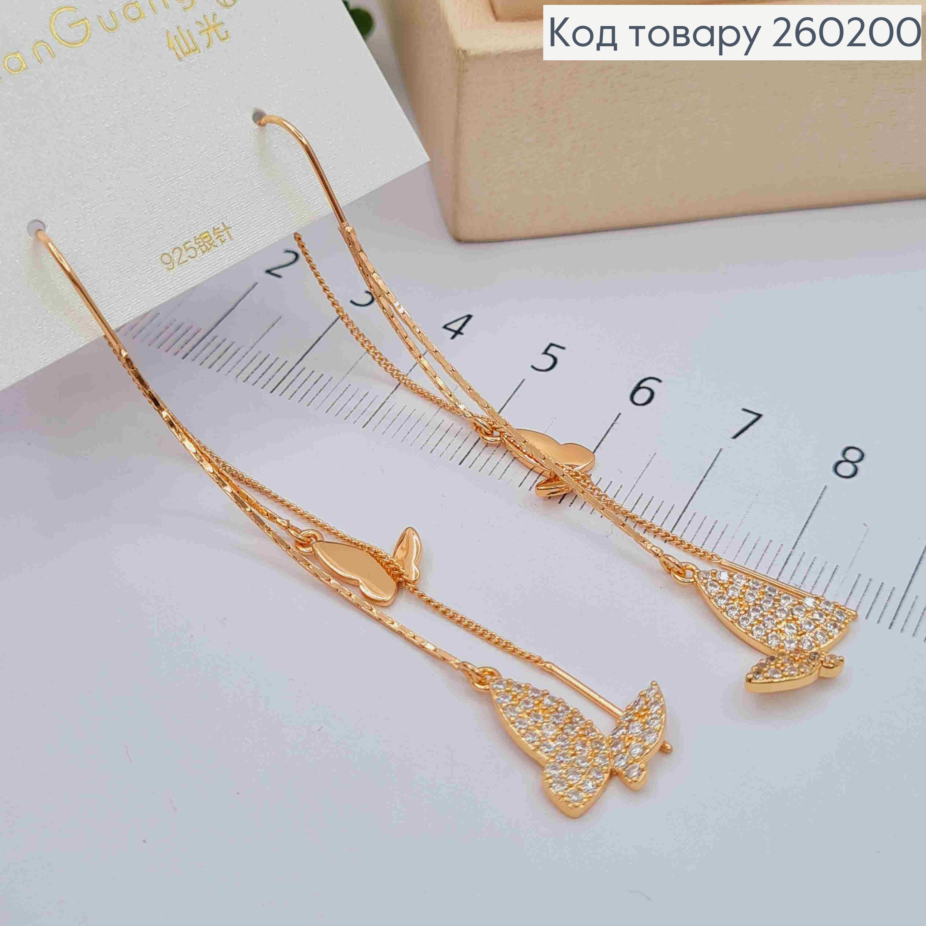 Сережки протяжки золотого кольору, з підвісними Метеликами в камінцях (6,8см),сталь XianGuang