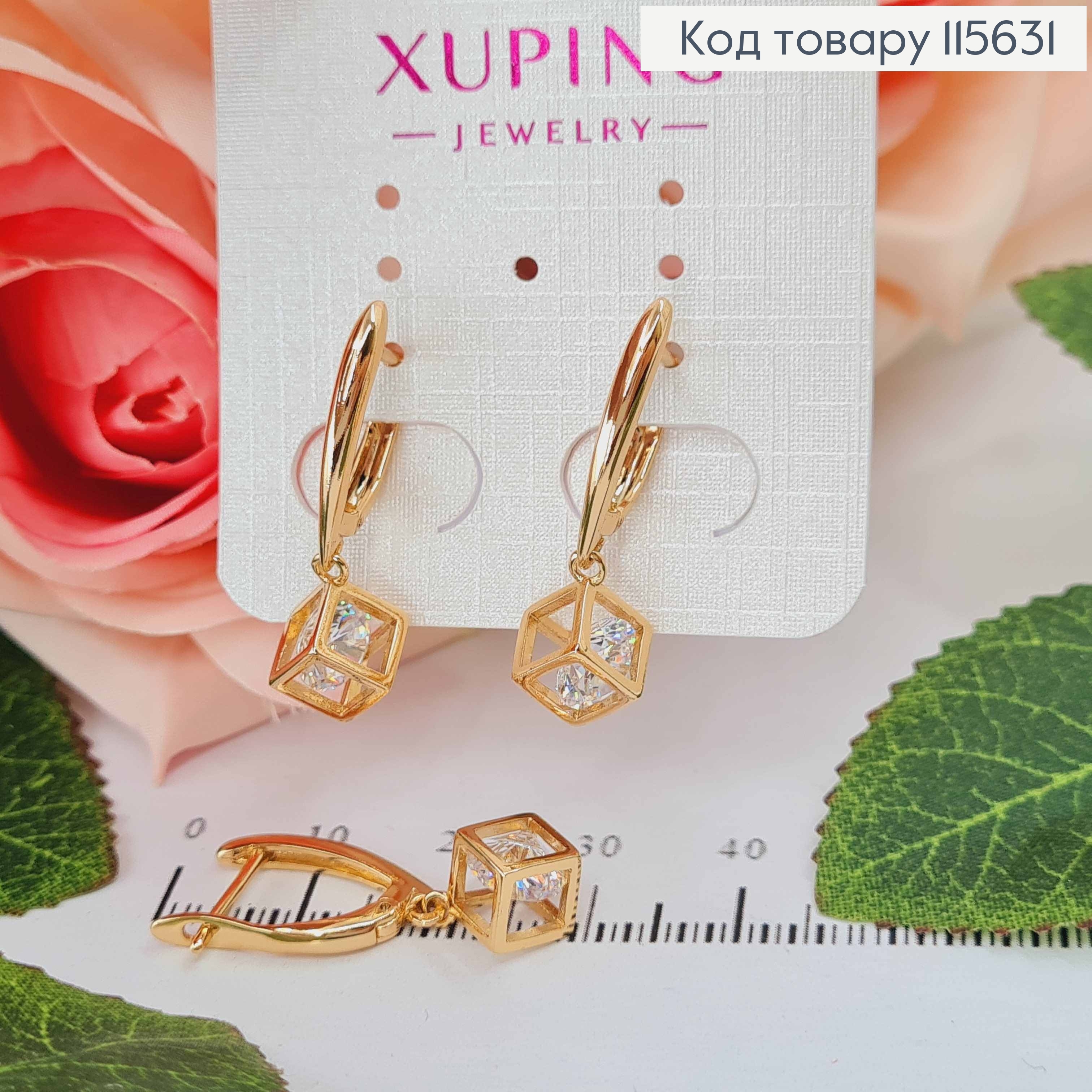 Сережки "Загадковий куб" 3см, з підвіскою кубиком з камінцем, англ. заст. Xuping 18K