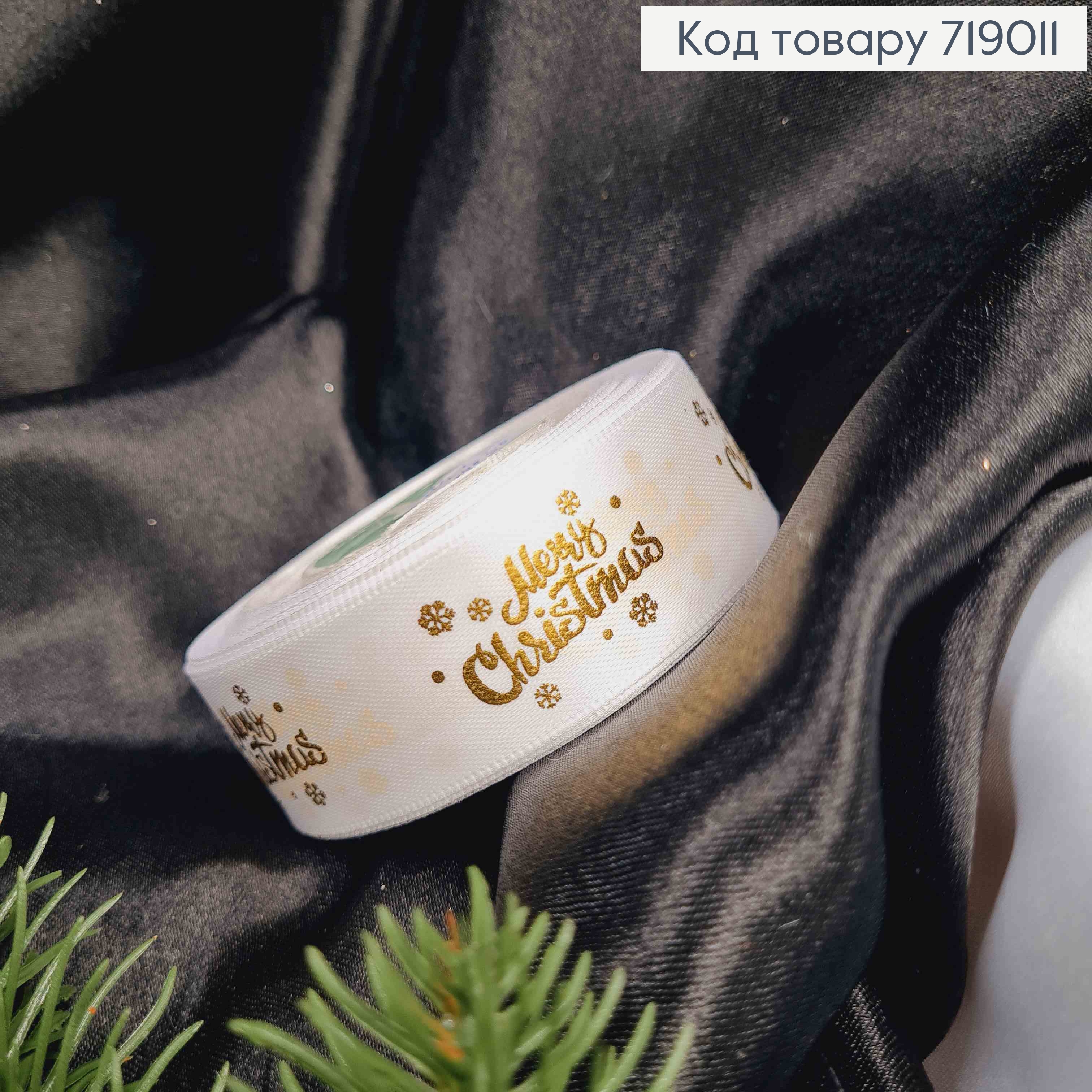 Стрічка атласна БІЛА з принтом "Merry Christmas" золотого кольору, шир. 2,5см, довж. 25 ярдів (23м)