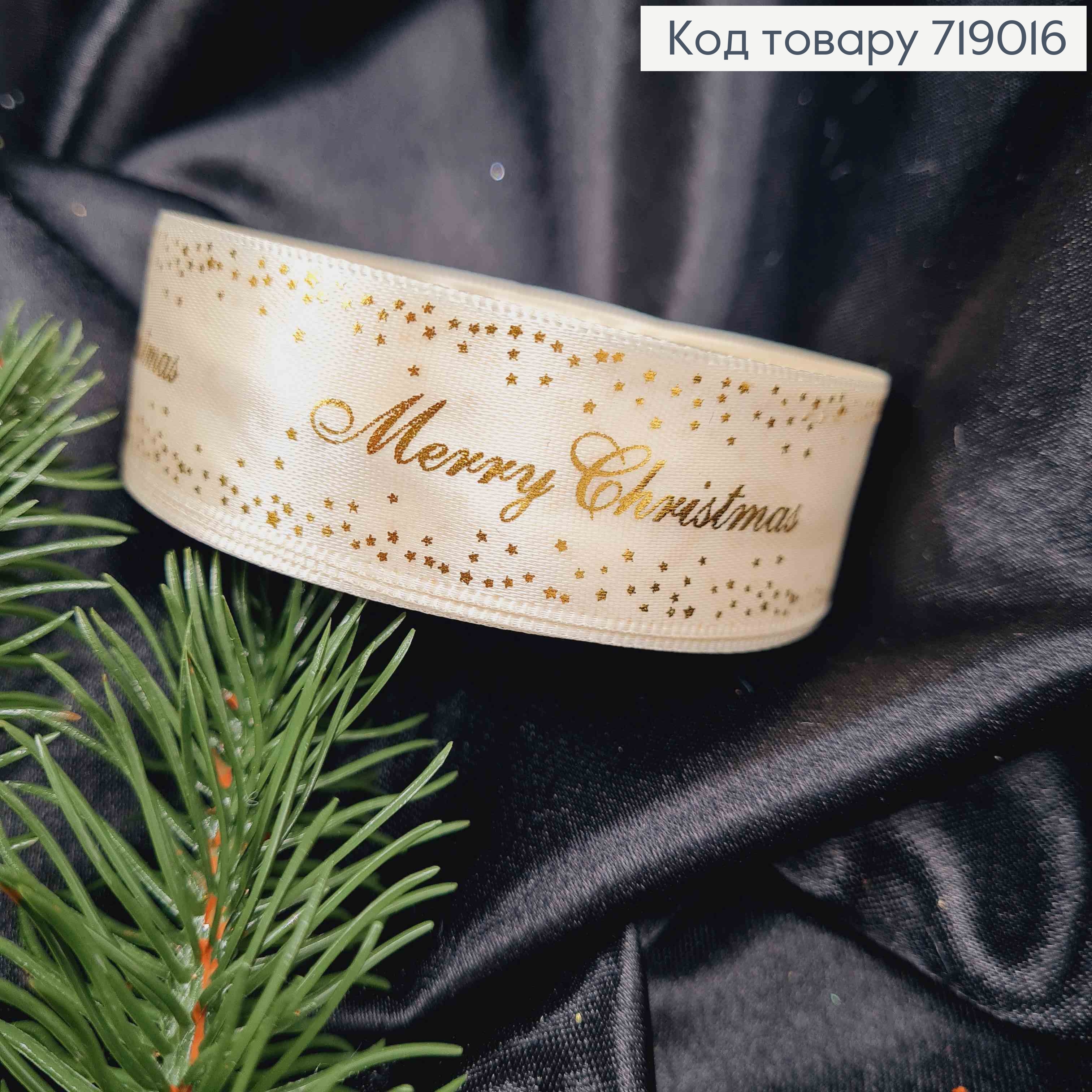Стрічка атласна КРЕМОВА з принтом "Merry Christmas" золотого кольору, шир 2,5см, довж 25 ярдів (23м)