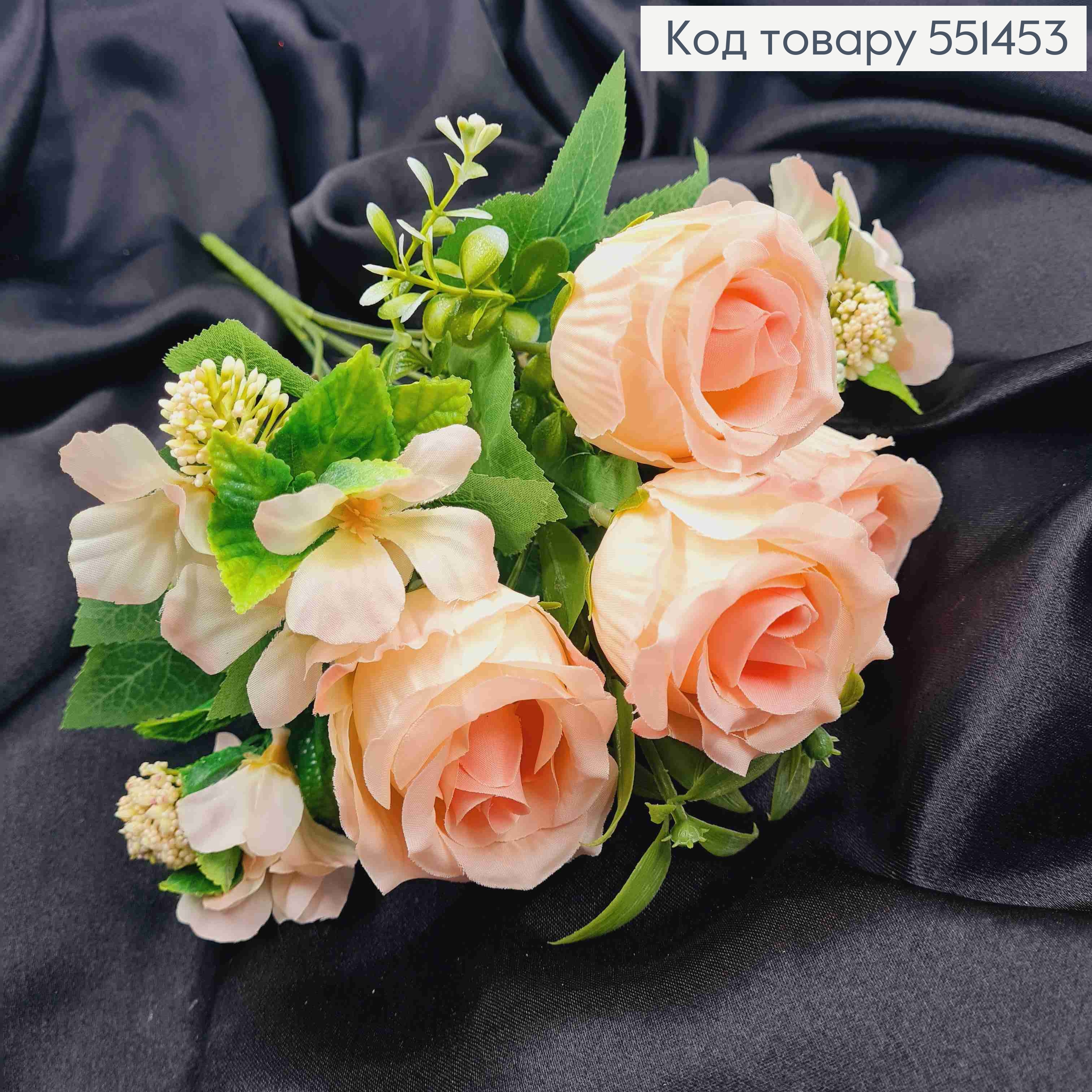 Штучна композиція Троянди, ПЕРСИКОВОГО кольору, 7 гілочок на металевому стержні, висота30см 551562 фото