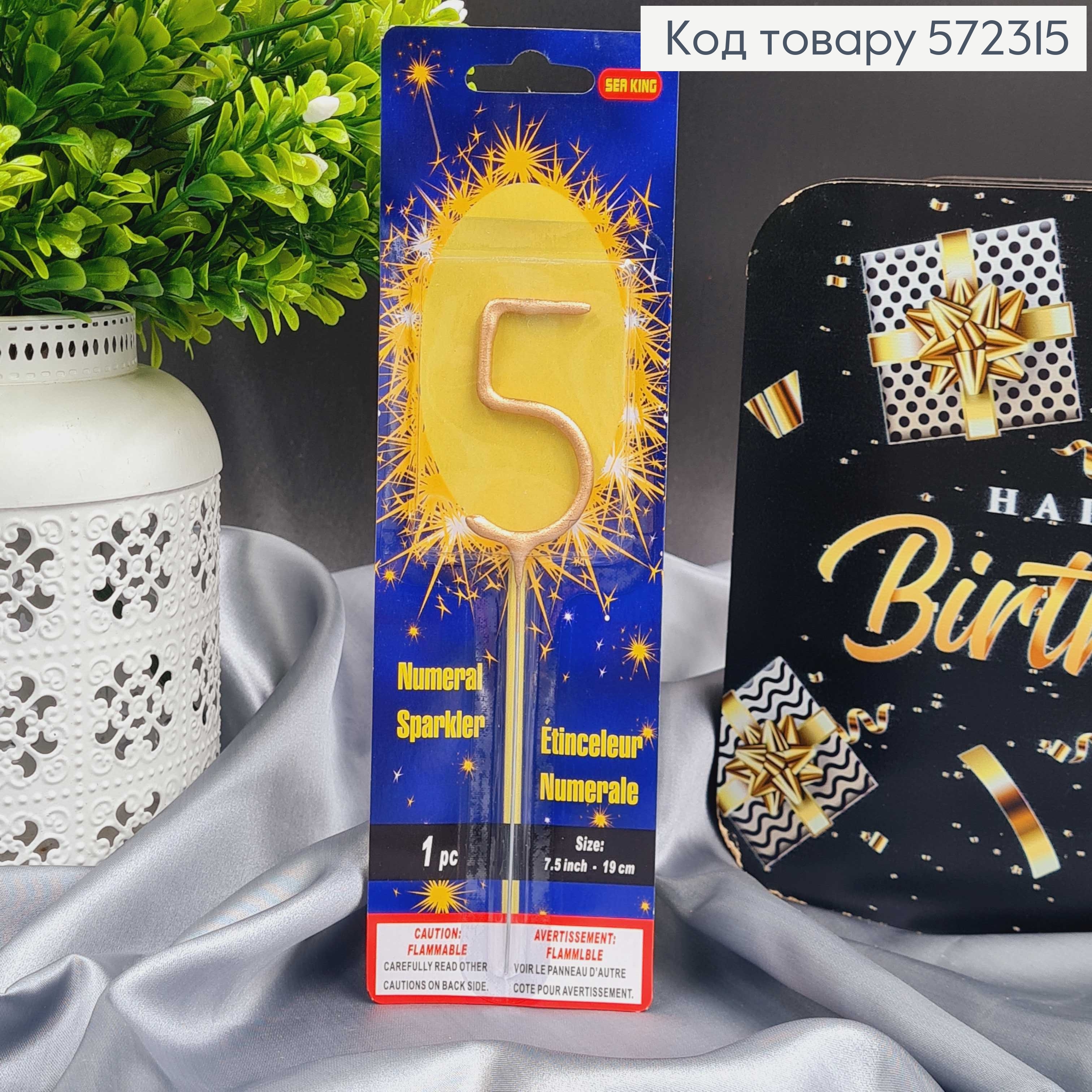 Свічка в торт цифра "5", Золото Бенгальський вогонь, 6,5+10см