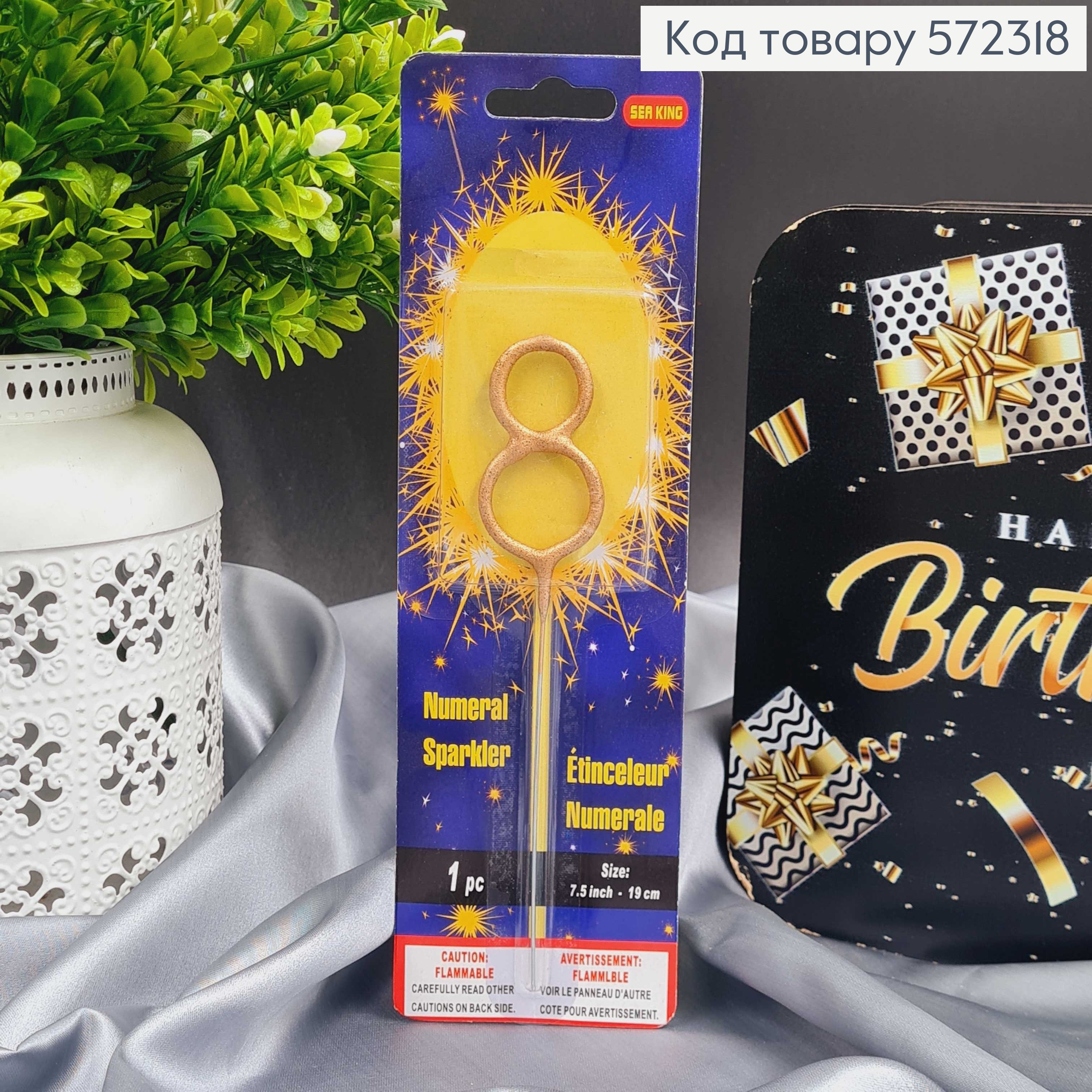 Свічка в торт цифра "8", Золото Бенгальський вогонь, 6,5+10см
