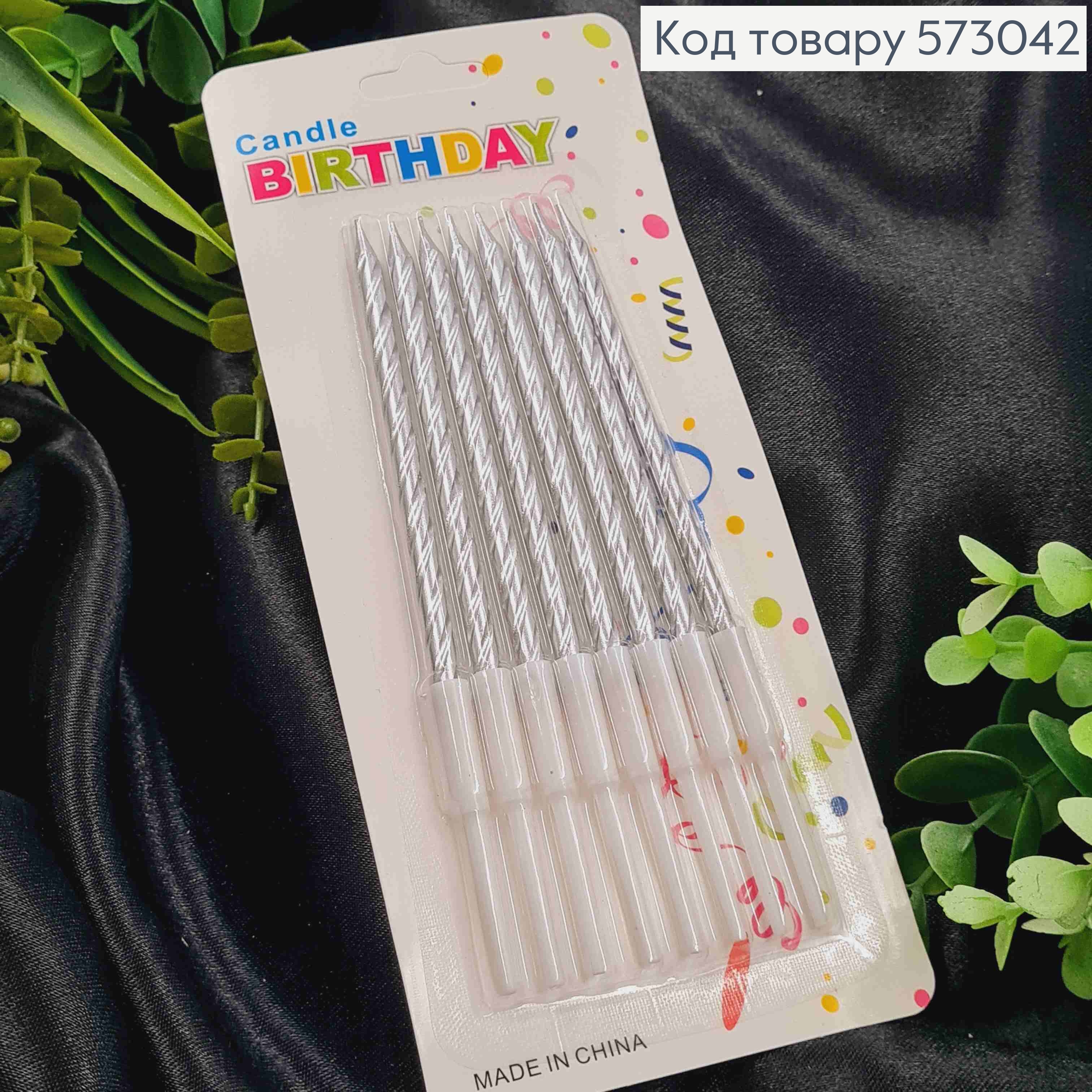 Свічки для торта Кручені, Срібні з підставками, 8шт/уп, 8,5+4,5см